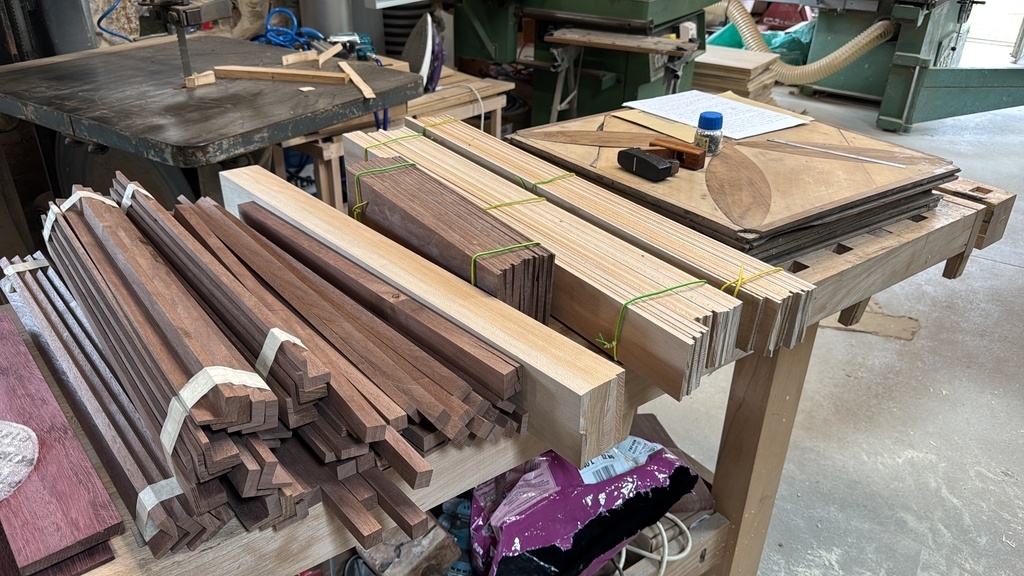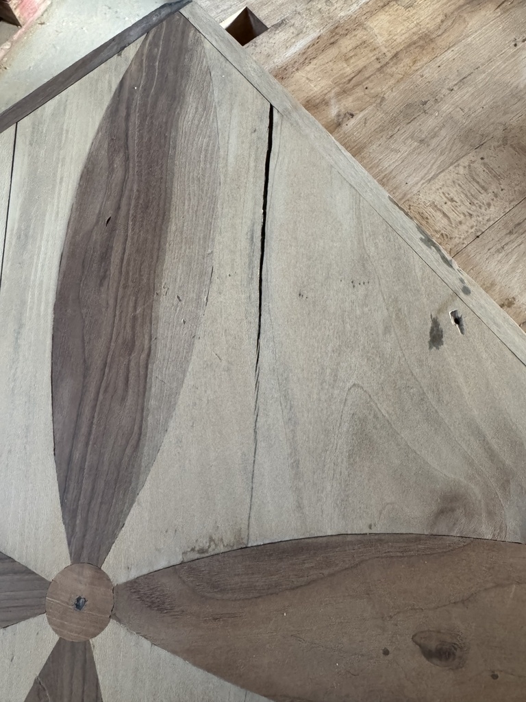 Les carrés, en intarsia de platane avec inclusions de noyer étaient en mauvais état. L'un d'eux était irrécupérable, et je l'ai fabriqué en marqueterie sur un support de mdf (au fond à droite sur la photo finale).