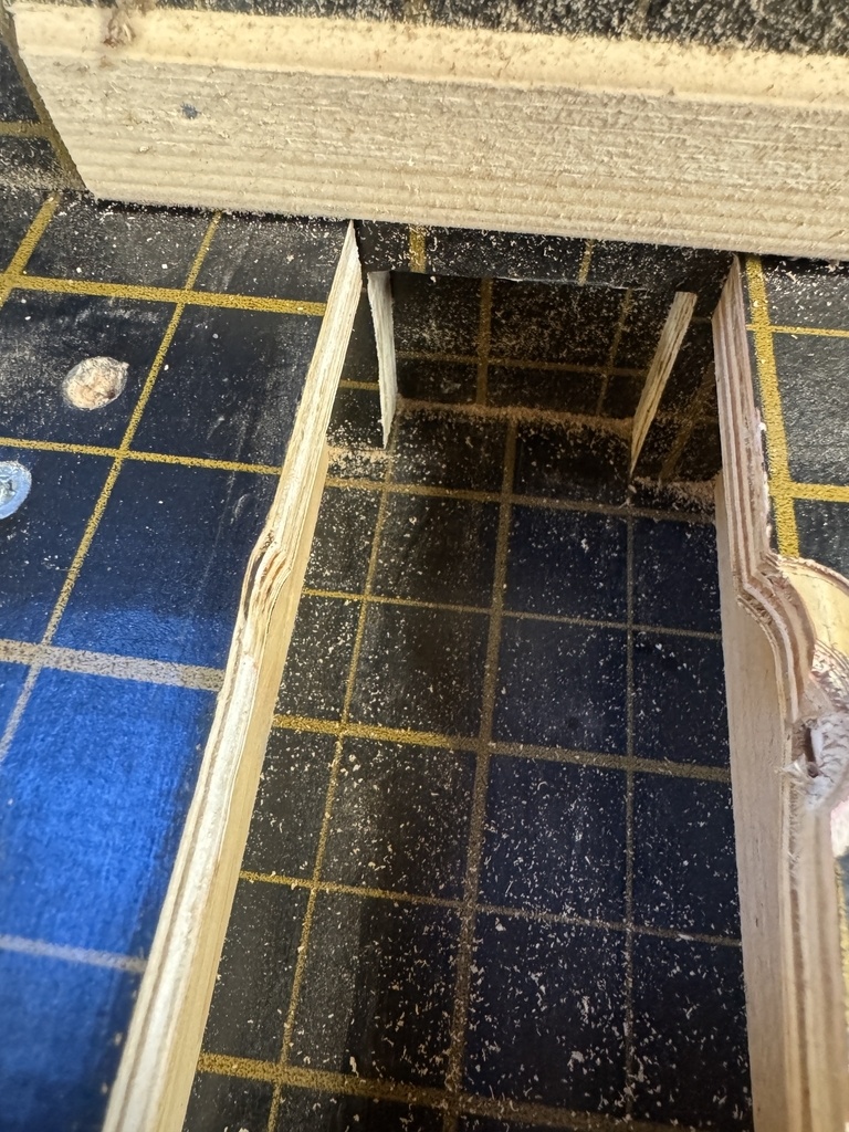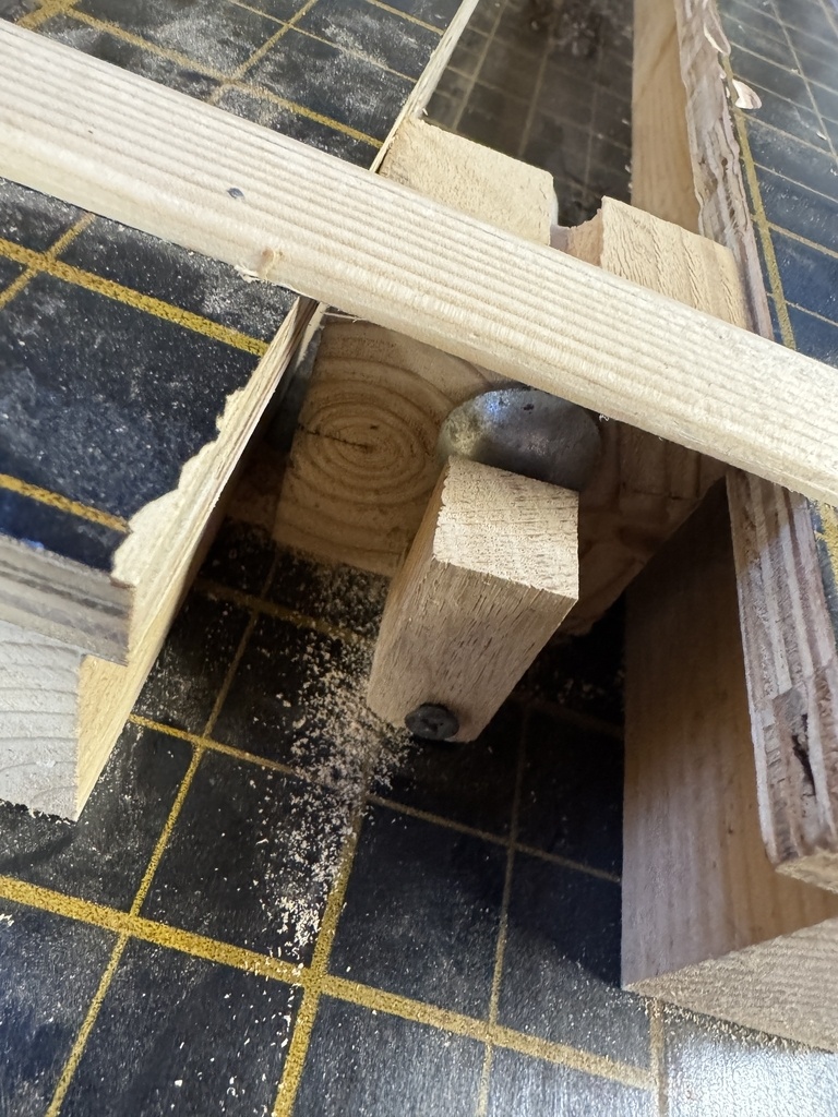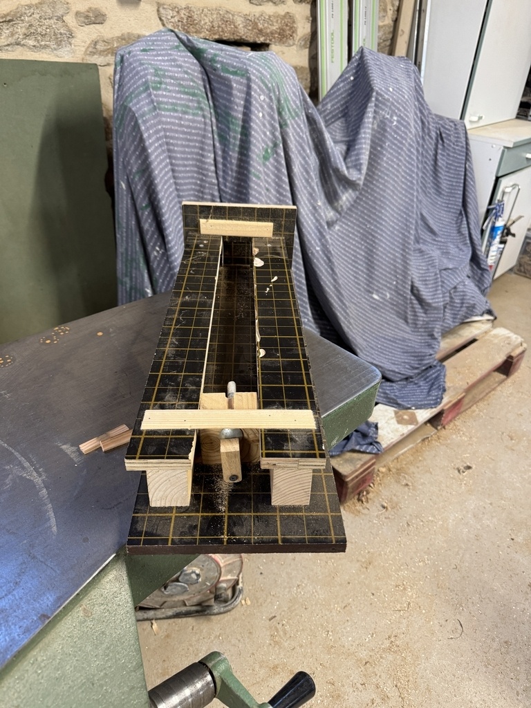 Pour le gainage : j'ai percé le bas du pied à la mortaiseuse à mèche pour pouvoir y loger une vis de 12mm de diamètre, puis dégrossi le gainage à la scie à ruban à 1mm du trait. Le montage comprend un logement carré qui bloque le haut du pied. A l'autre extrémité, ladite vis est placée à la bonne hauteur pour que la pente du pied corresponde au plan de glisse de la défonceuse ; elle rentre dans le trou du pied et je la verrouille avec un levier en bois. Une fois le pied ainsi tenu en place, il reste à passer la défonceuse (j'ai utilisé mon affleureuse DeWalt, plus légère) avec une fraise à surfacer. Et on recommence pour les trois autres faces. Je rafraîchissais l'affûtage de la fraise entre chaque pied pour garder une bonne qualité de surface.