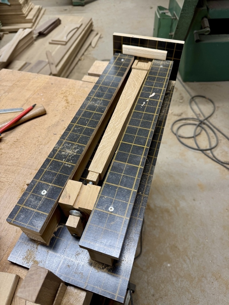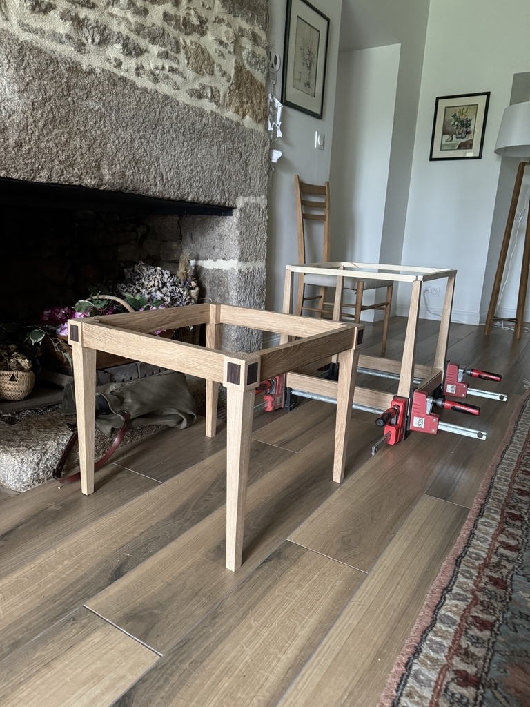 Fabrication des piétements en chêne, pieds gainés, inclusion dans les dés d'une pièce de Sycomore des Indes.