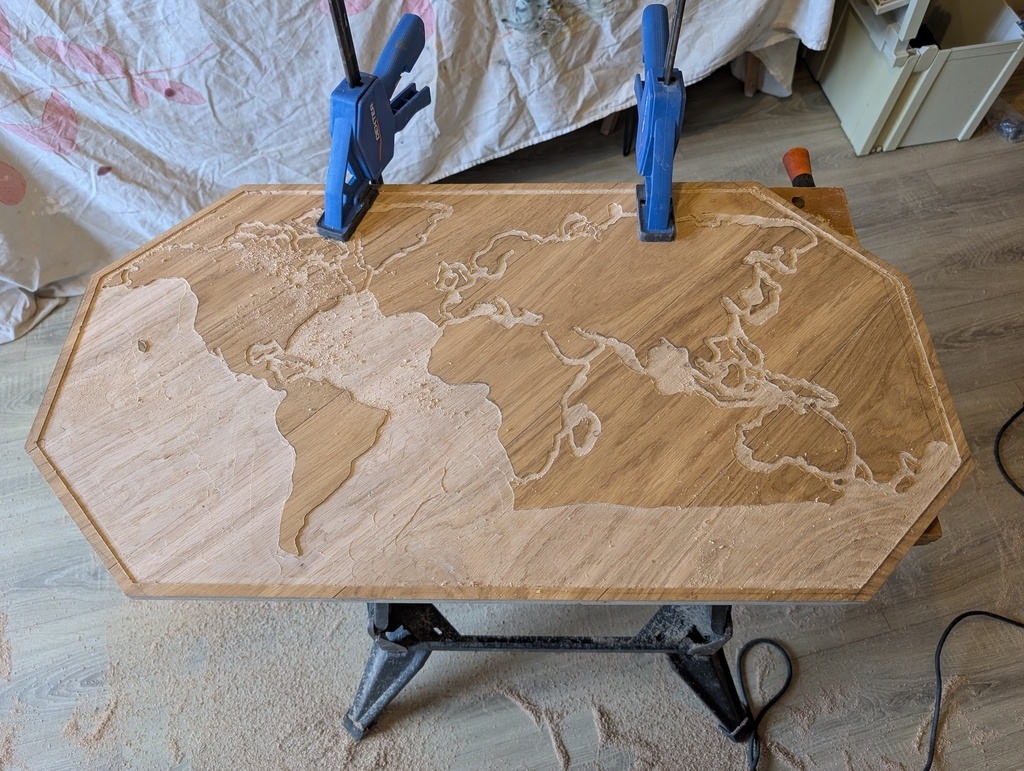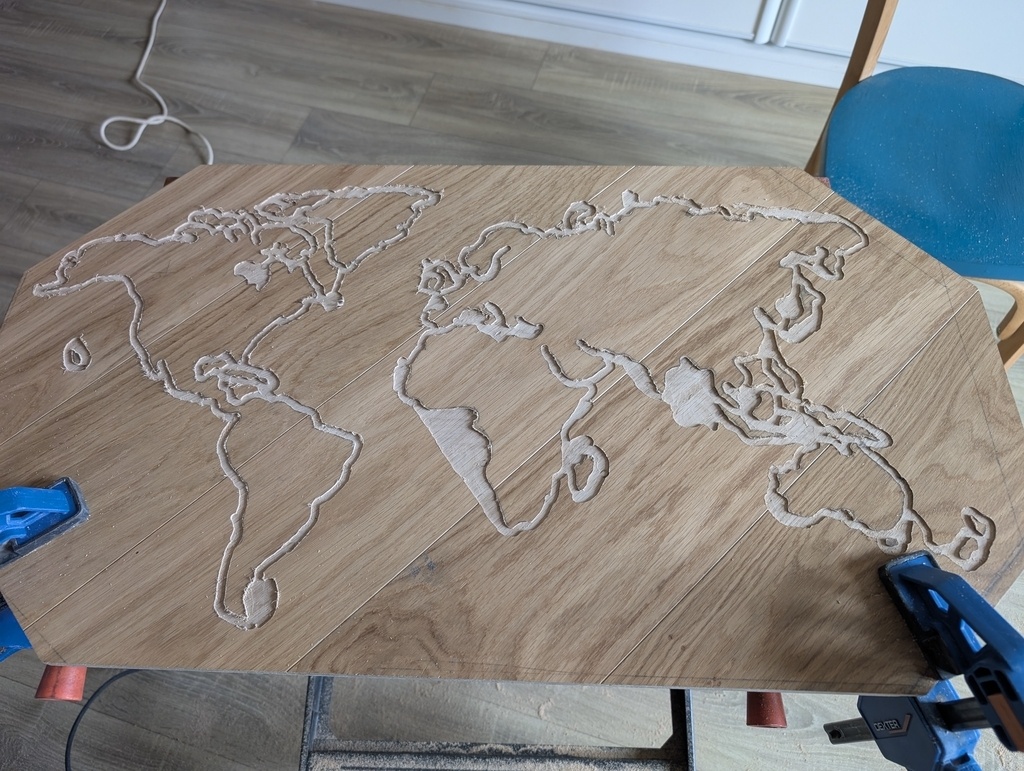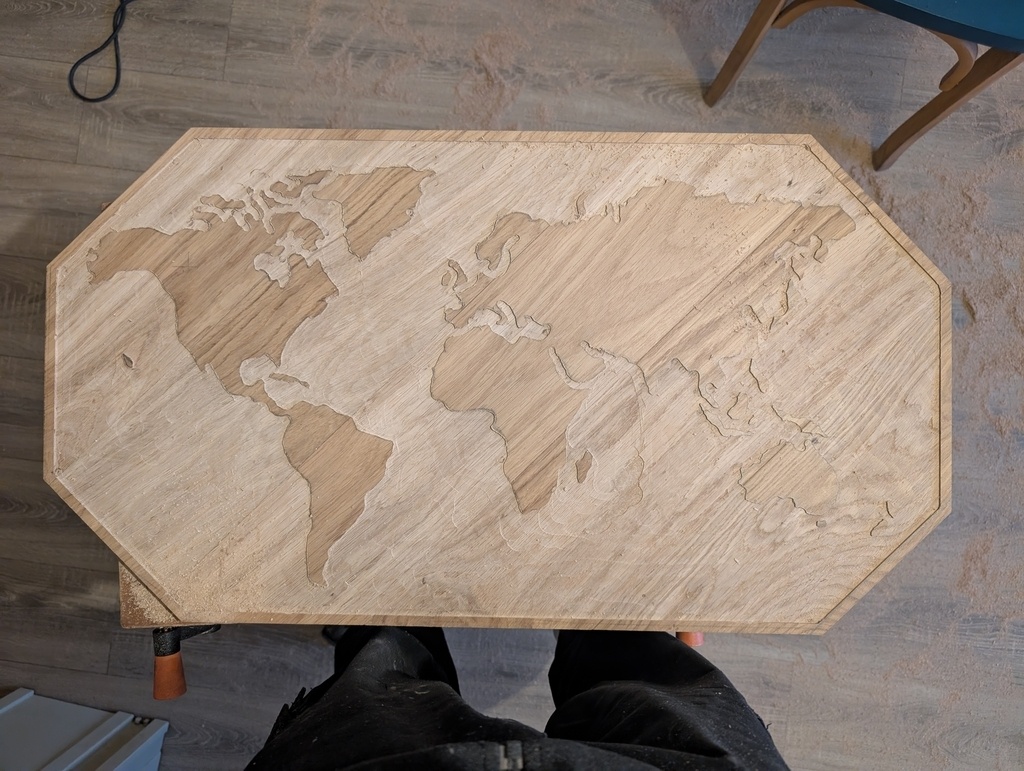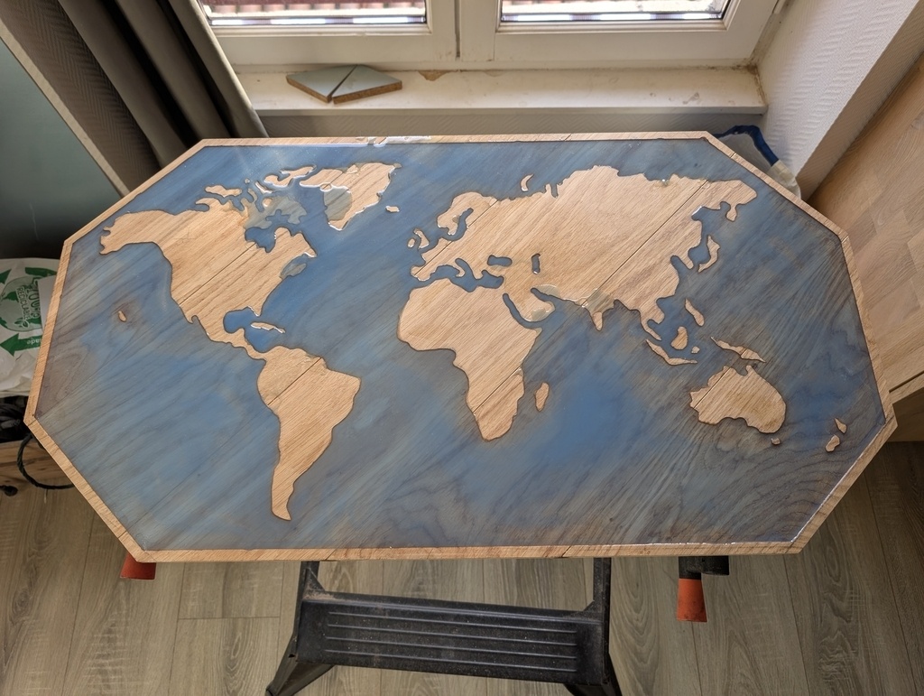Réalisation d'une carte du monde avec des chutes de lames de parquet et résine époxy.