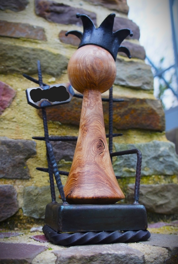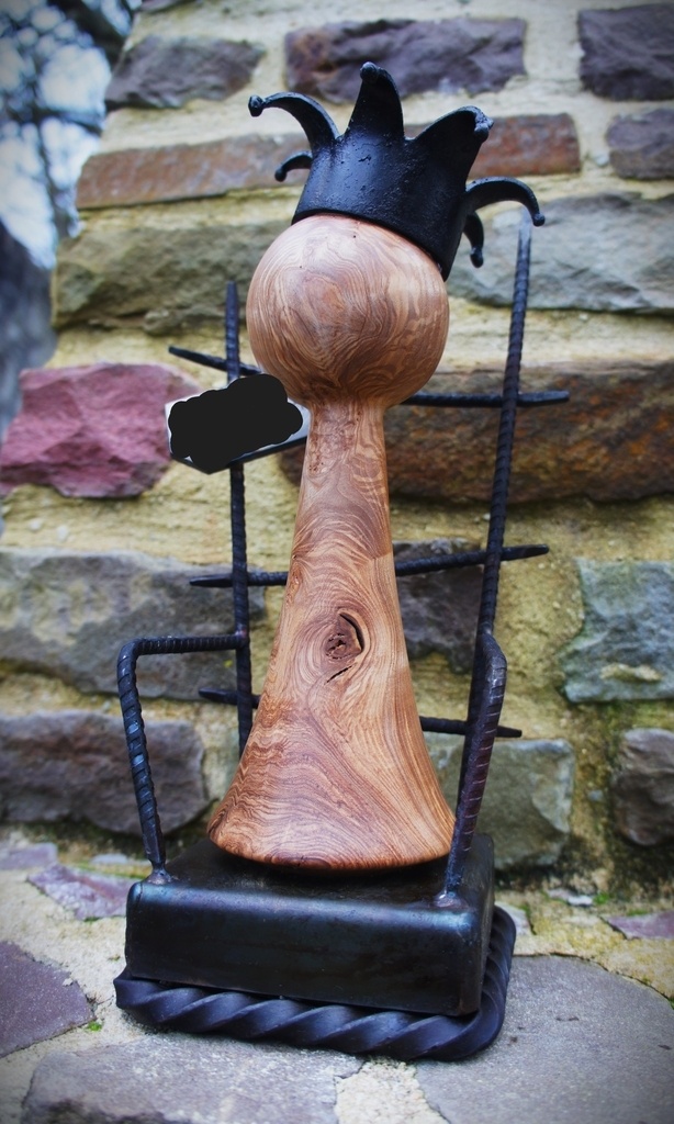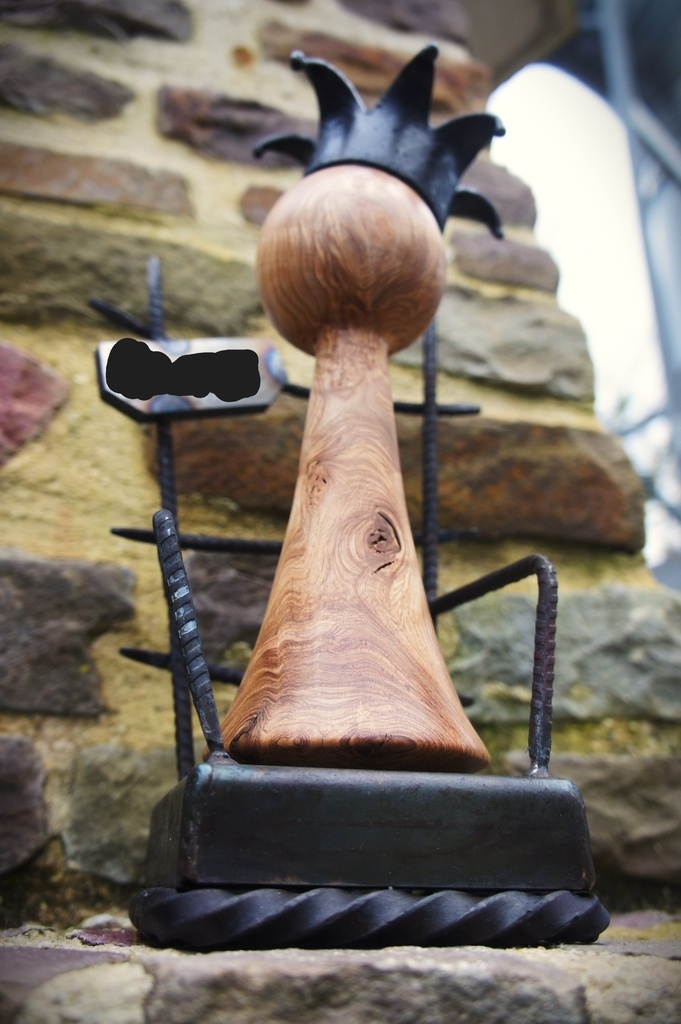 Bonjour, un trophée d'échecs réalisé en frêne et métal. Le frêne est huilé. Finition de l'acier par bronzage (huile de lin+chalumeau).