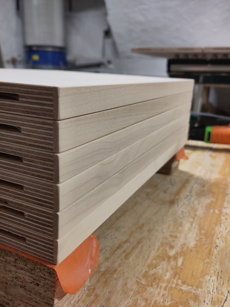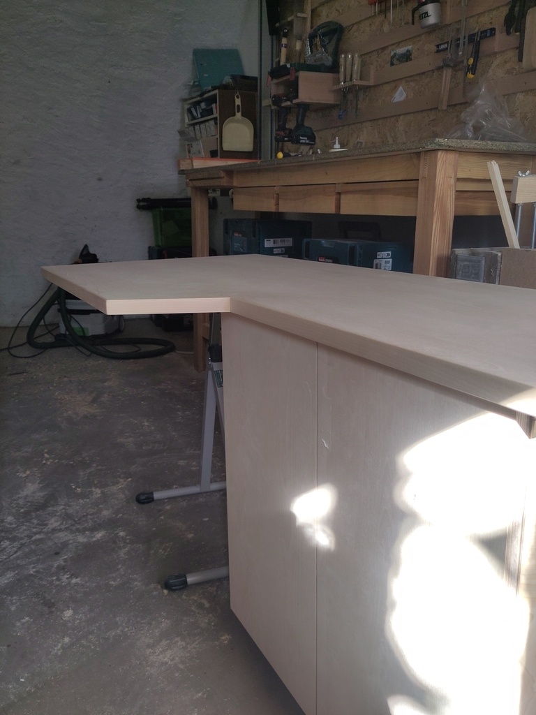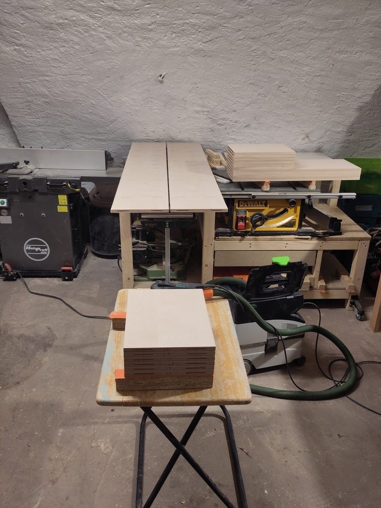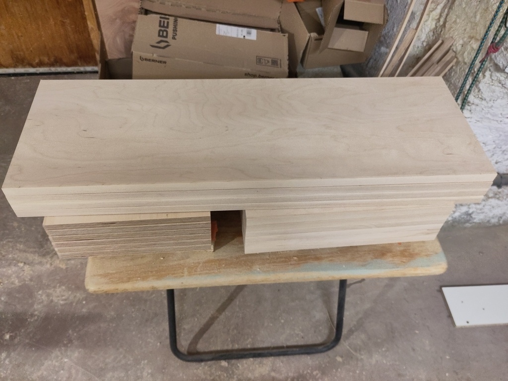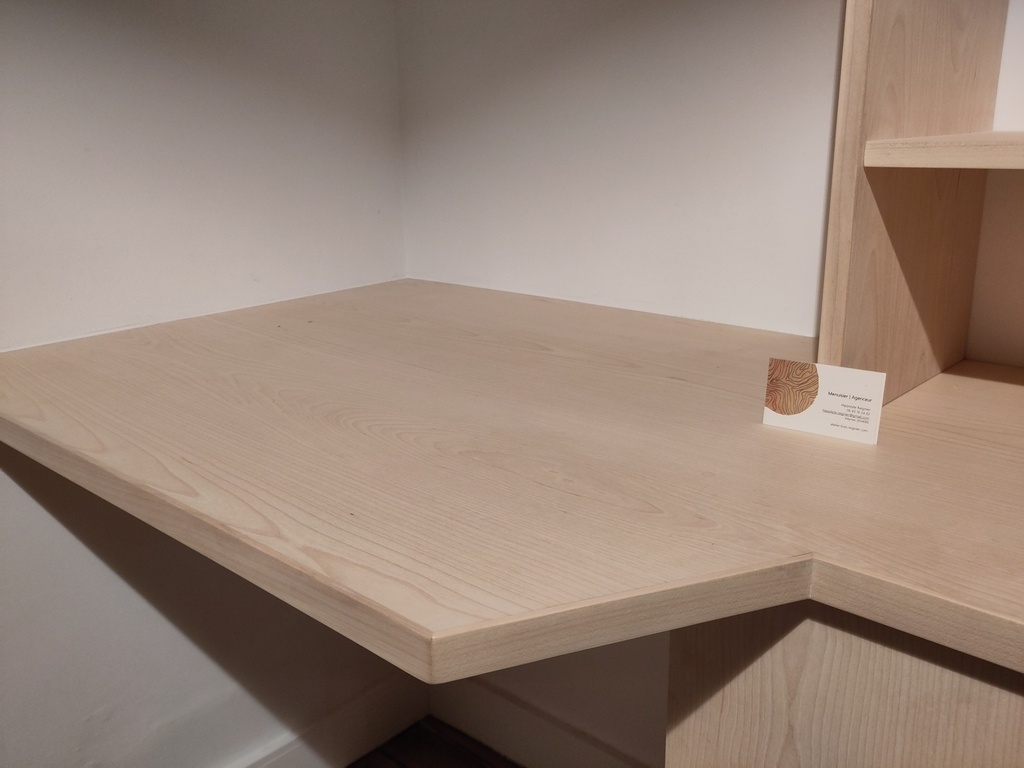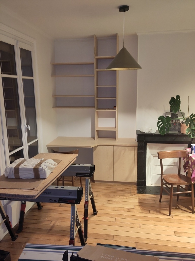 L'ensemble est en contreplaqué Bouleau 18mm (sauf le bureau en 27mm), avec chants plaqués en Erable. J'en avais qui traînait et je trouve le mariage pas mal du tout. Finition Huilé, avec quelques couches de cire pour le bureau.Les étagères tiennent principalement en tasseau prisonnier,sauf pour la partie droite avec des taquets malins qui de toute façon est pas trop vue à cause de la cheminée. Niveau quincaillerie pour le caisson bas, rien de bien neuf, charnière heetich et push open.
