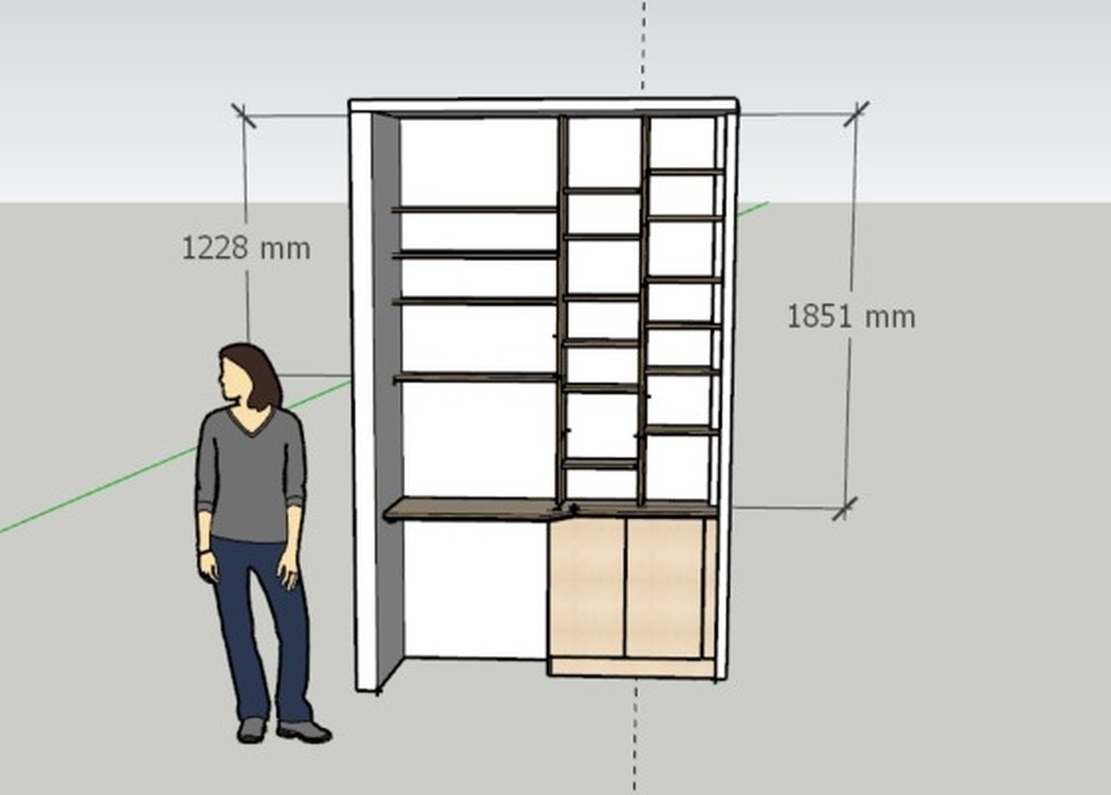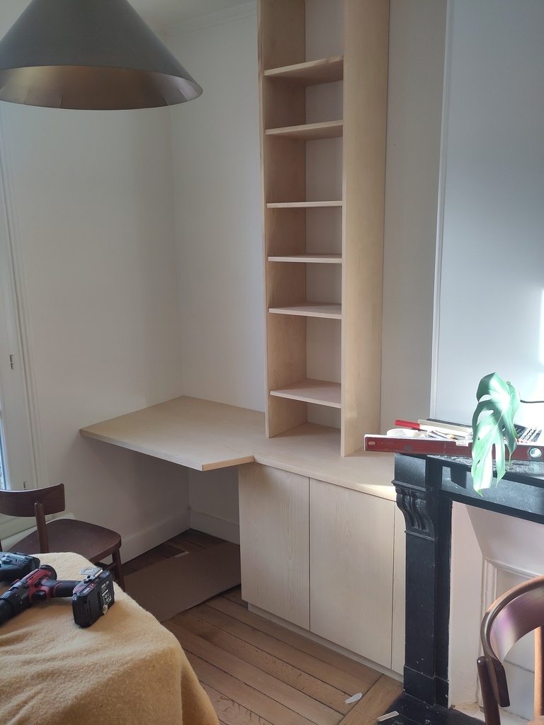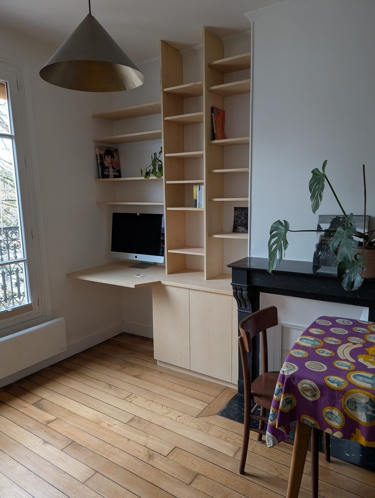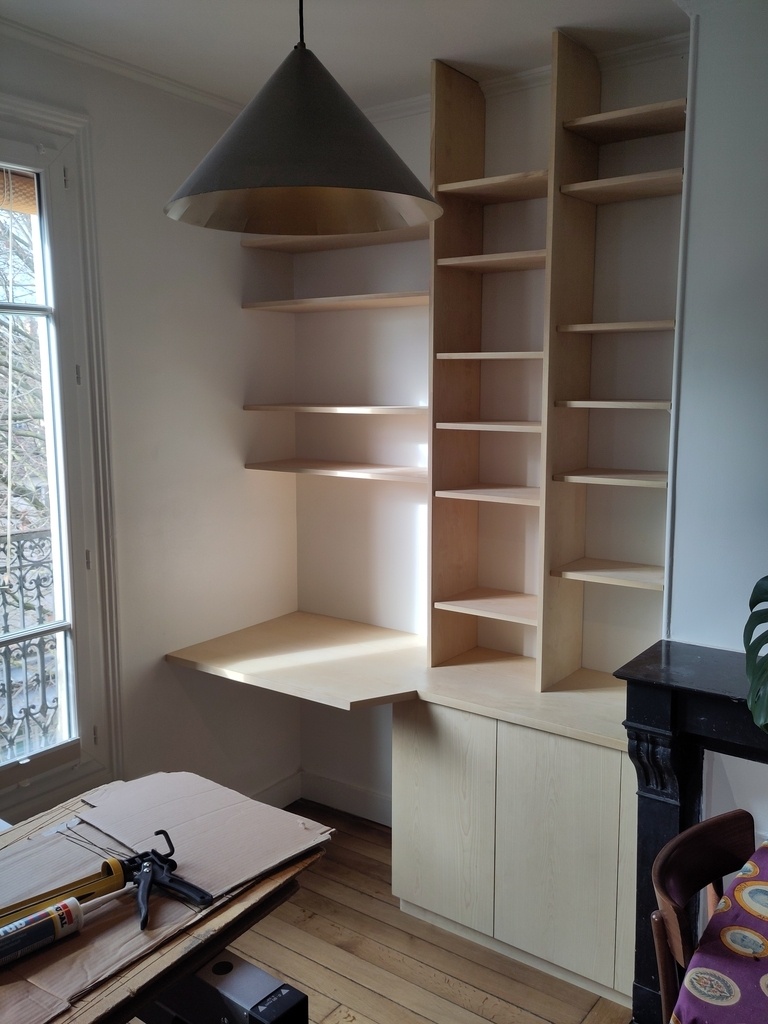 Petit agencement en bibliothèque/bureau pour un renfoncement d'un appartement parisien. C'est un projet pour me tester en lançant ma petite entreprise!
