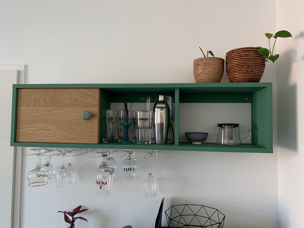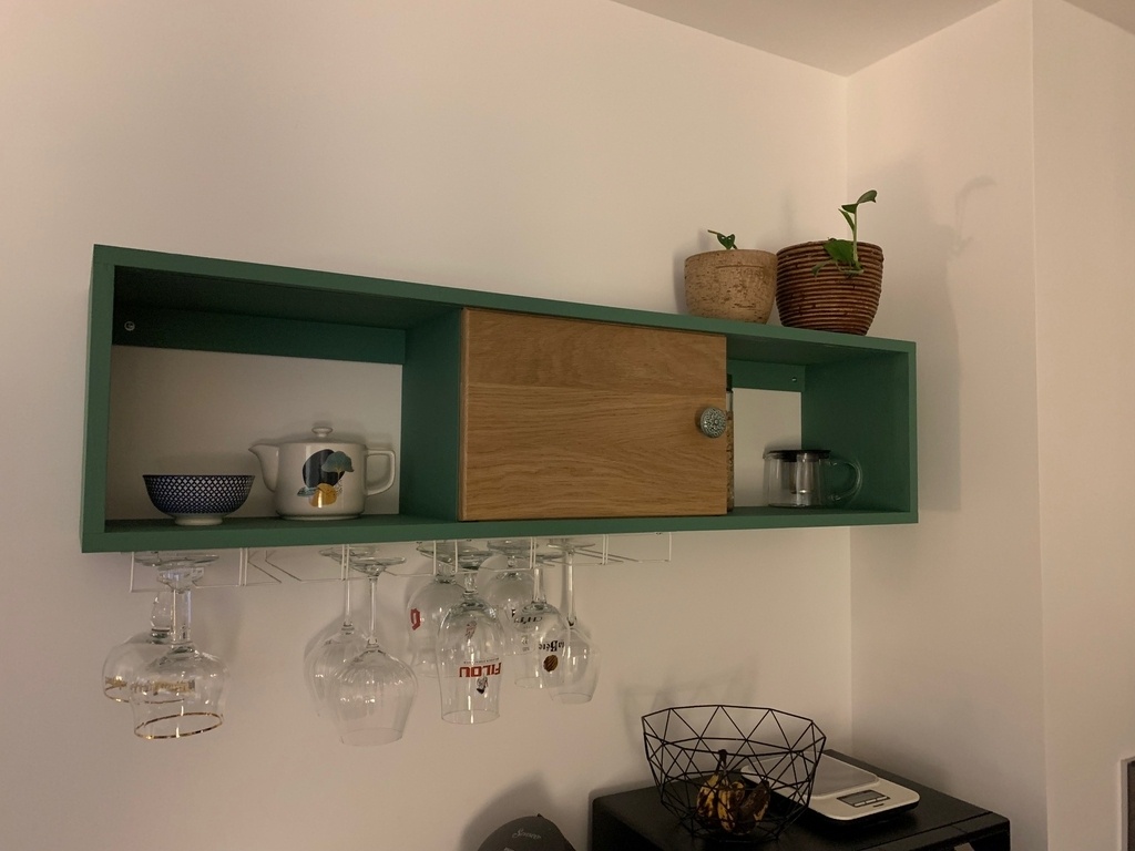 Une petite étagère pour rajouter du rangement dans la cuisine. Les supports pour verres de type bar proviennent d'une enseigne suédoise bien connue. la porte centrale, en chêne, coulisse à droite ou a gauche.