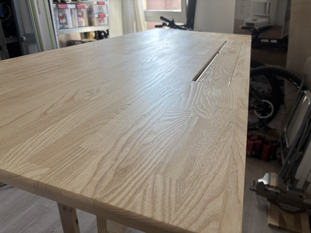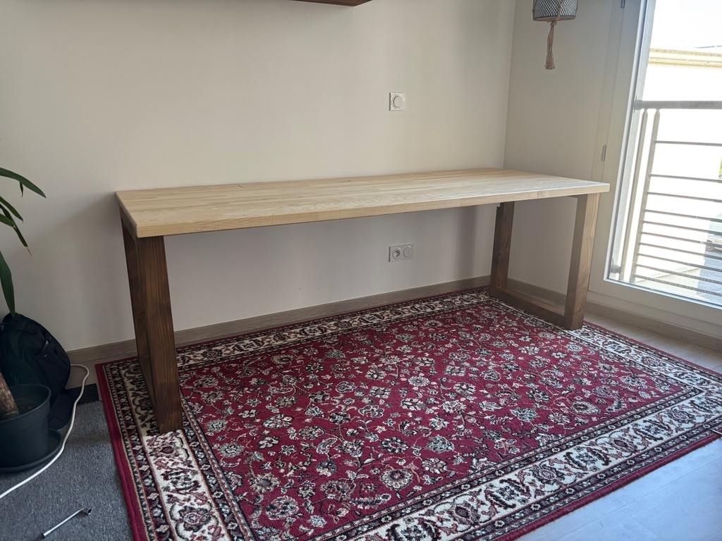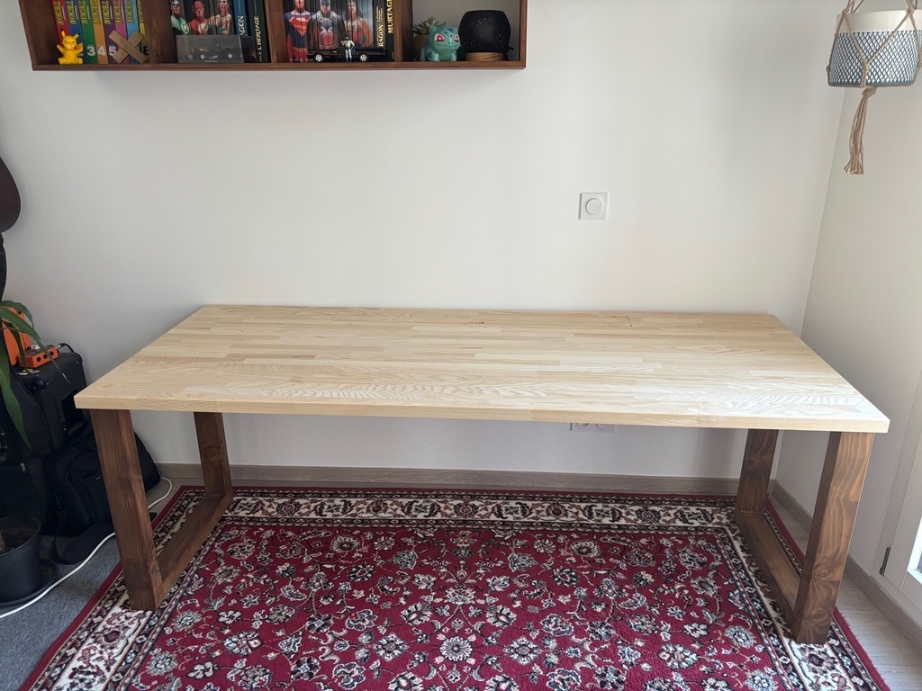 Enfin un vrai bureau pour le télétravail à deux. 2m x 80cm avec une trappe centrale pour y passer les câbles et chargeur en tout genre. Je suis parti de panneau en lamellé-collé de frêne , ce qui m'a permis d'ajouter des renforts en dessous pour éviter le cintrage.
