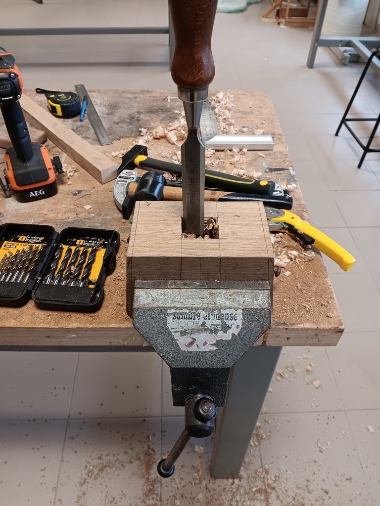 J'ai commencé par dégrossir à la scie à main, puis j'ai réalisé la mortaise à l'aide d'un perceuse (seul outil electro-portatif utilisé), et je l'ai finie avec un bédane et mes ciseaux. La rape m'a été bien utile, et je me suis donc dit qu'il fallait que j'investisse dedans car j'ai utilisé celle de mon établissement n'en ayant donc pas encore une perso.