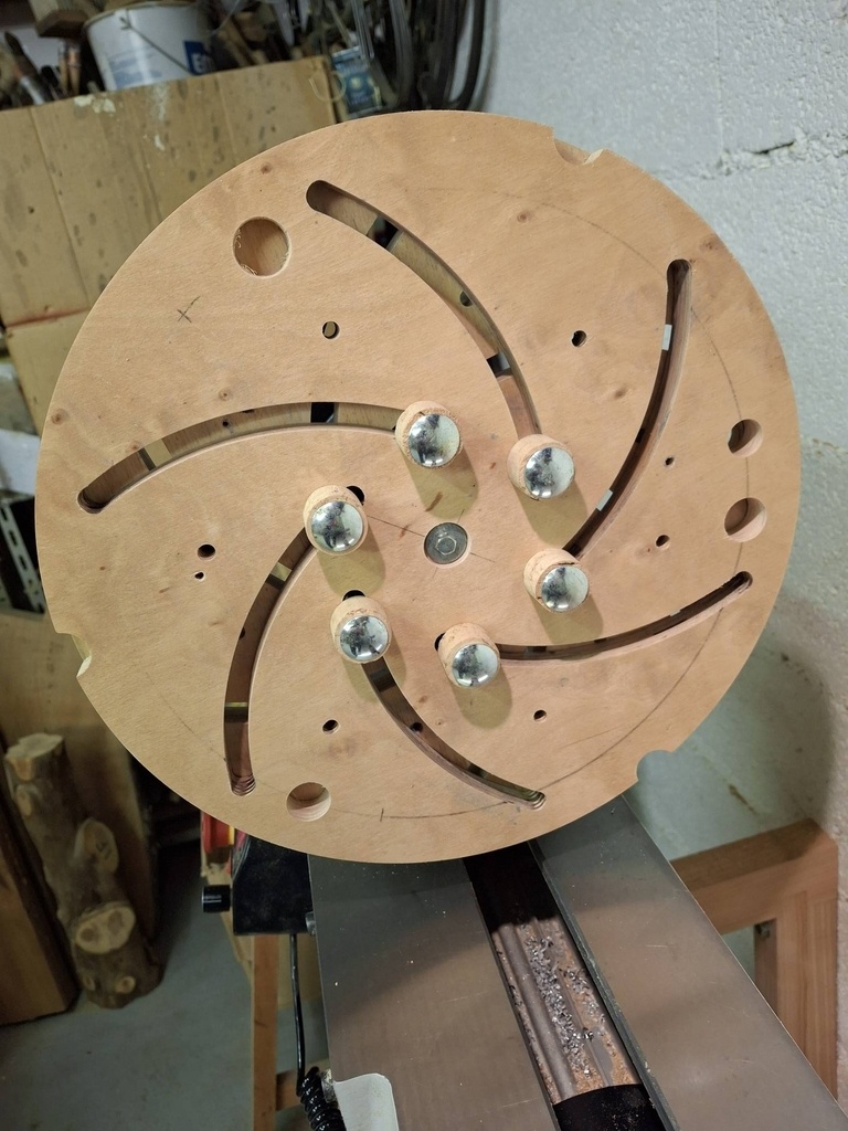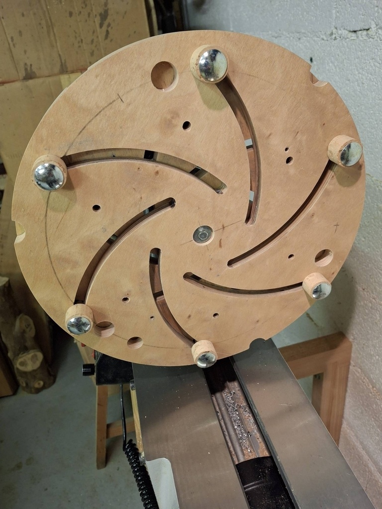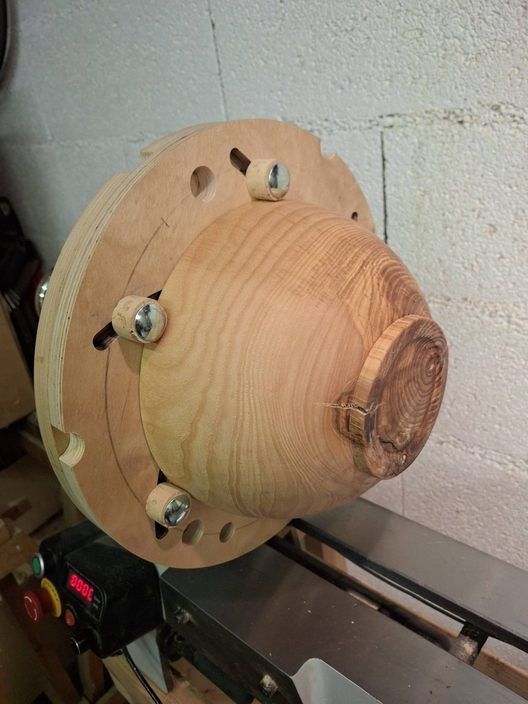Un projet que j'avais en tête depuis bien longtemps. Je l'ai commencé avant d'avoir acquis un mandrin pour mon nouveau tour AXMINSTER, ce qui explique le système de centrage choisi.