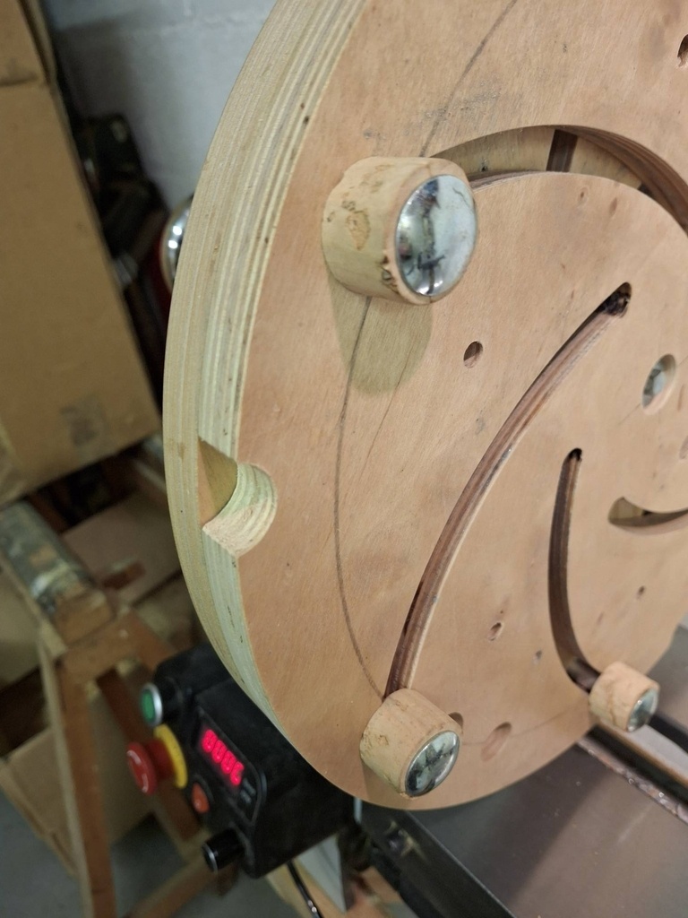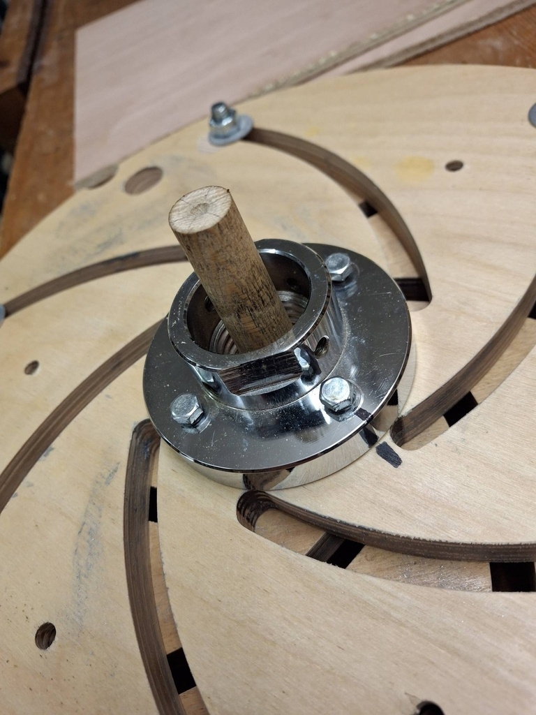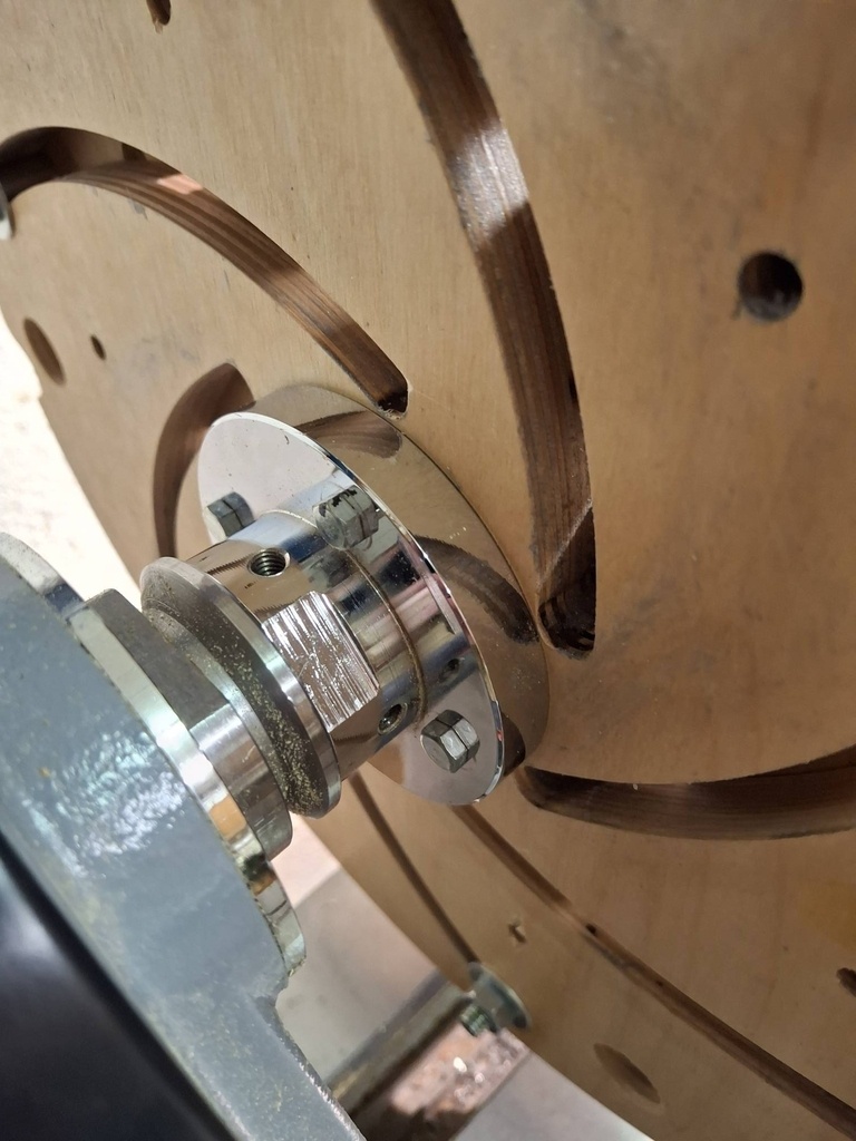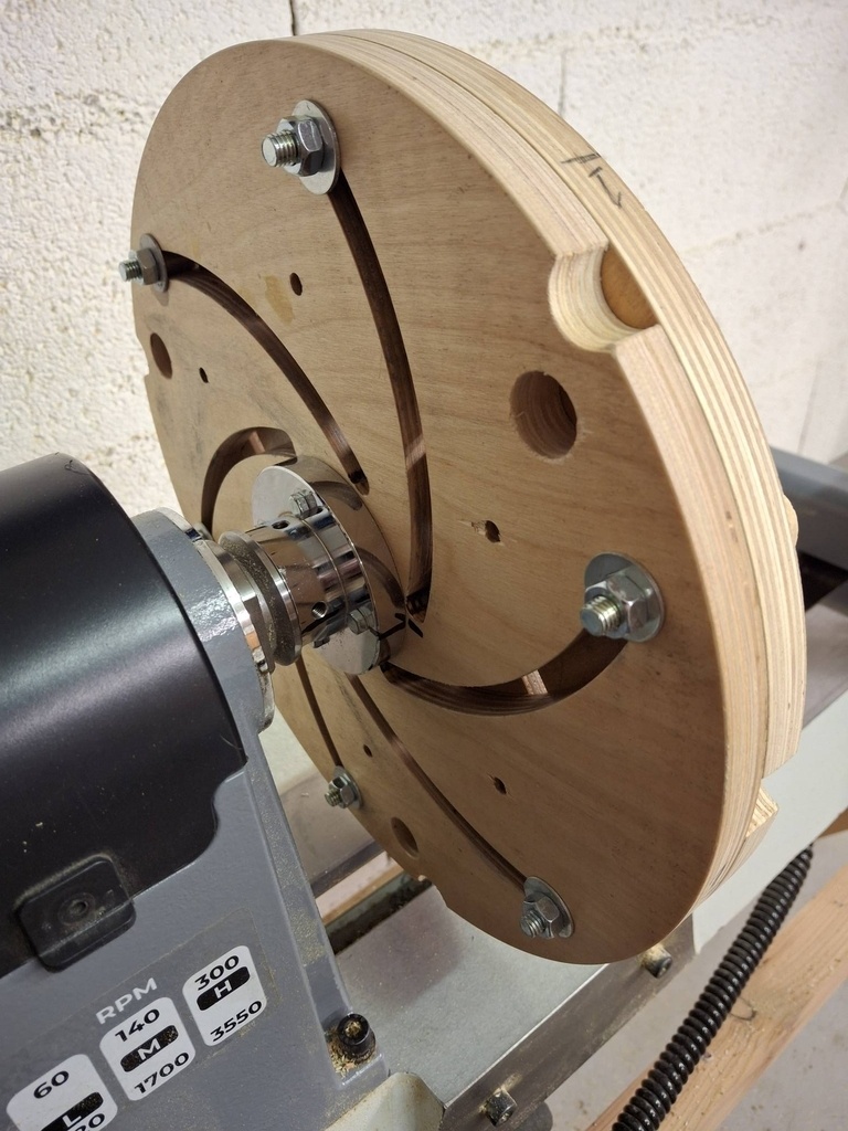 Les disques de CTP sont montés sur le disque de 80 mm du tour par 4 tirefonds raccourcis (photos 1 & 2), le cône morse maison centre les disques CTP sur l'arbre du tour (photo 3).