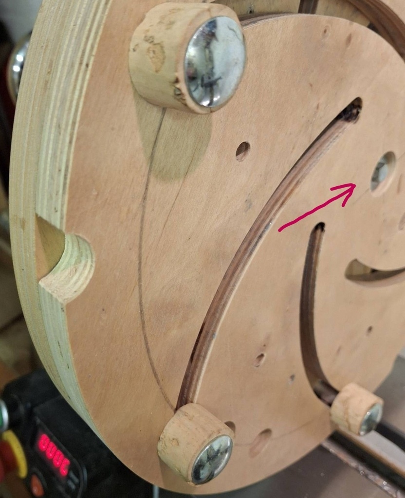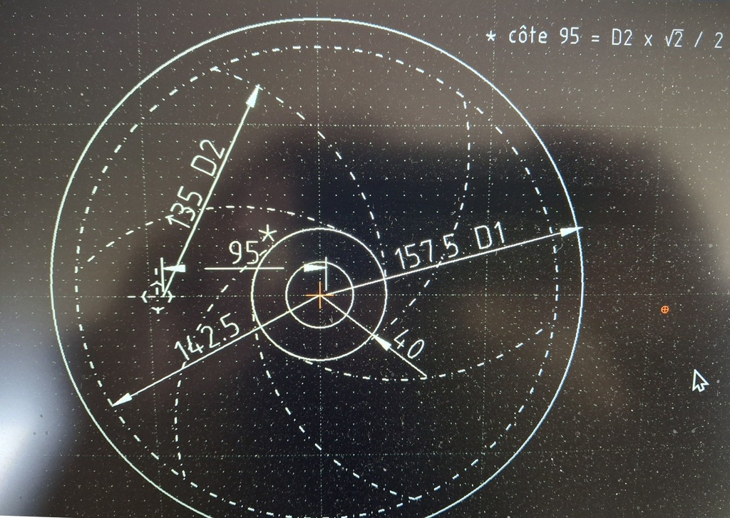 Au cas ou cela peut intéresser quelqu'un, pour obtenir des fentes qui se croisent à 90°, voici la relation entre le diamètre des fentes et le positionnement des centres par rapport à celui du plateau (pour voir toute la formule il faut ouvrir la photo).