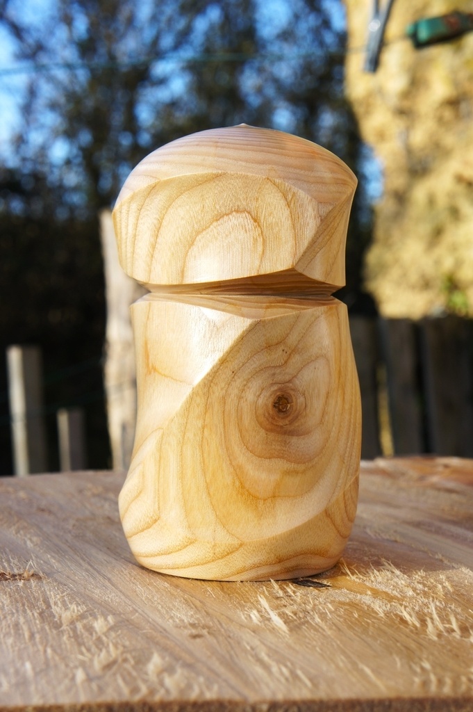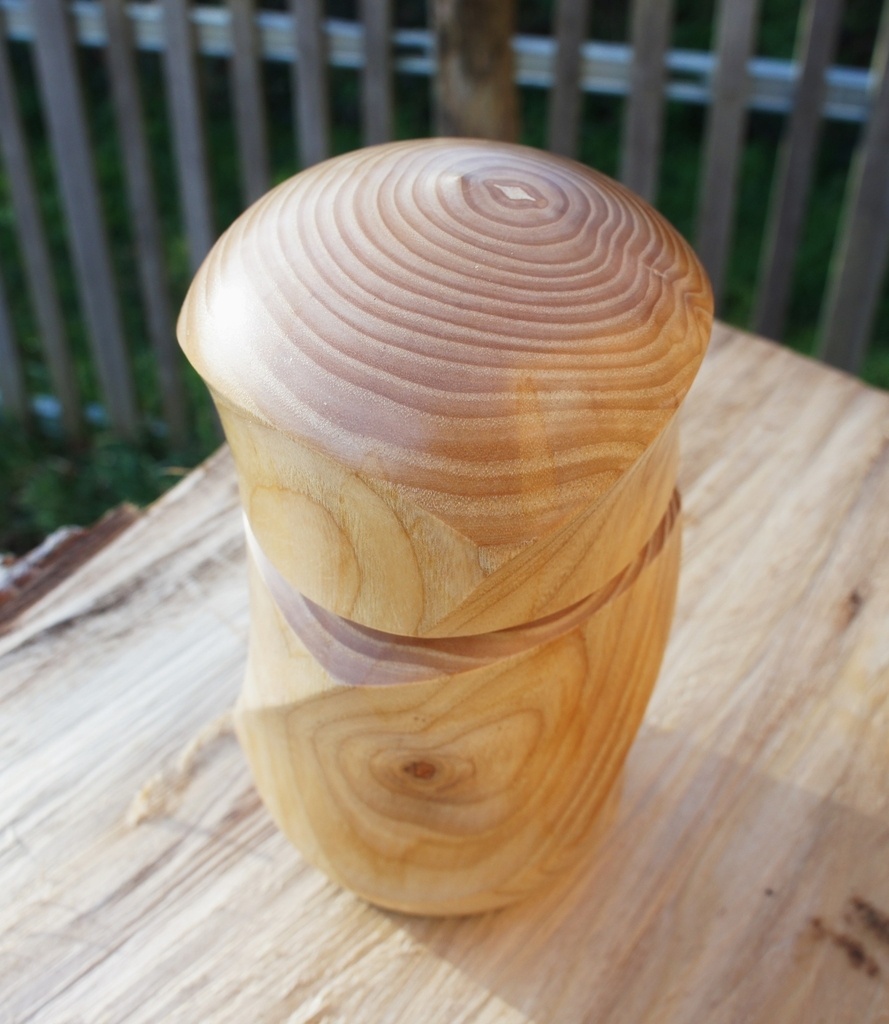 Bonjour, une autre boite torse en frêne, plus grand format, qui servira de pot à café (moulu). Le vernis est fait à la gomme laque.