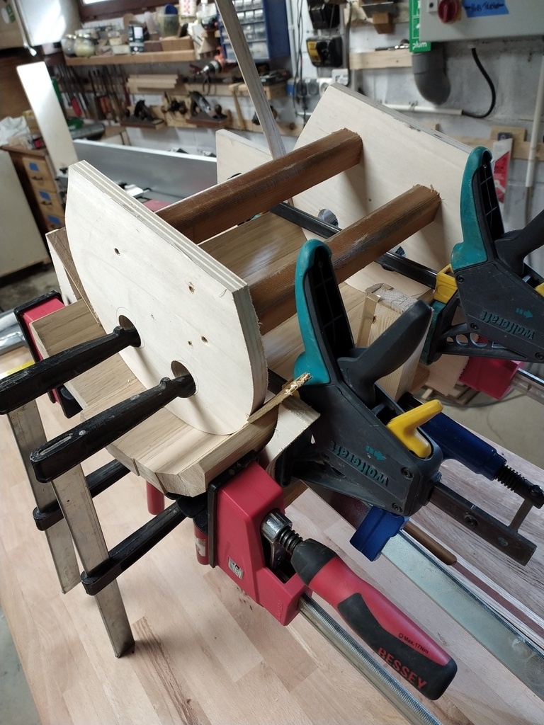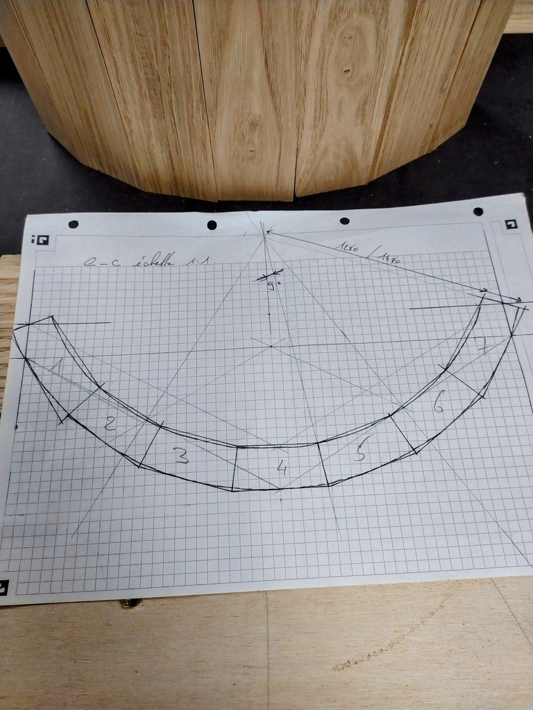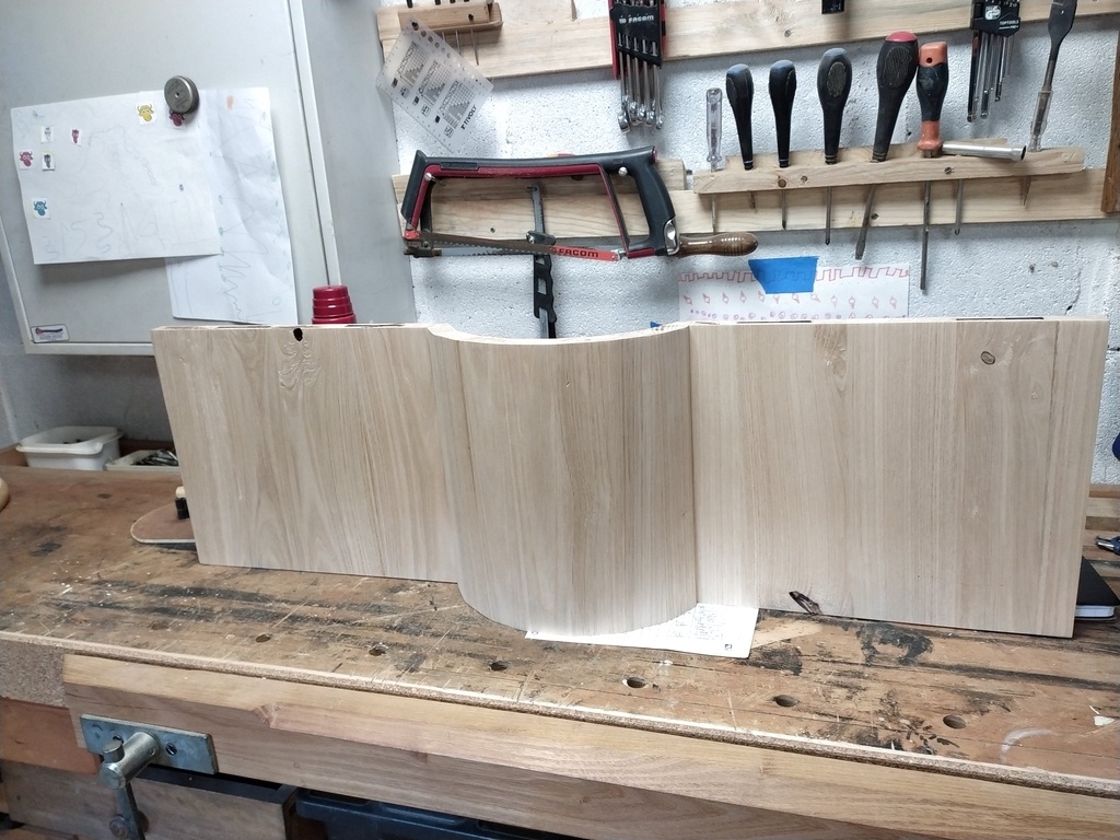 J'ai travaillé à l'épure pour réaliser l'arrondi central. Le panneau complet a ensuite été déligné pour pouvoir ébonifier la partie inférieure et faire le raccord de couleur avec les plinthes latérales.