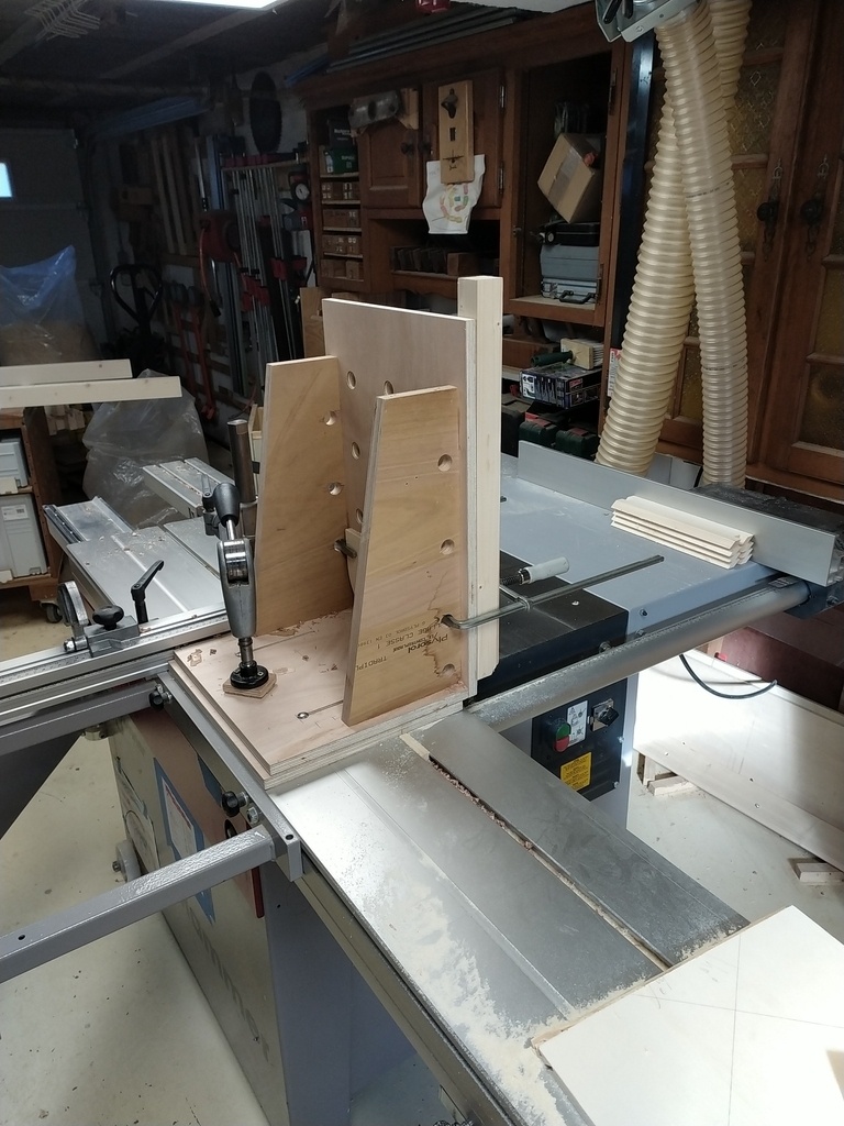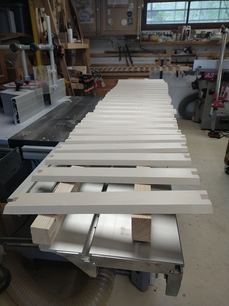 Pour le débit des lames de persiennes, je suis passé par des blocs capables rainurés que j'ai ensuite débités à 40°. J'ai dû passer par un montage d'usinage qui m'a imposé de refixer le bloc entre chaque lame. Pour 80 lames, 5h de boulot.