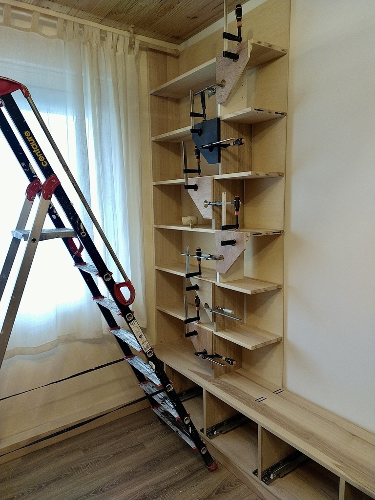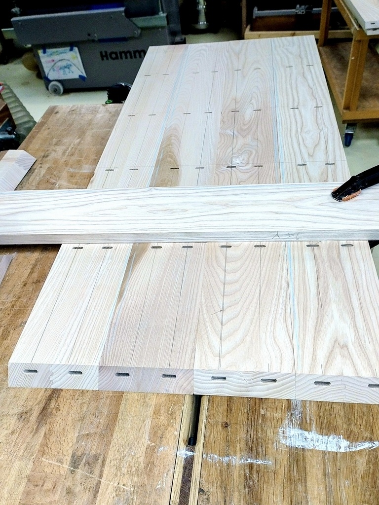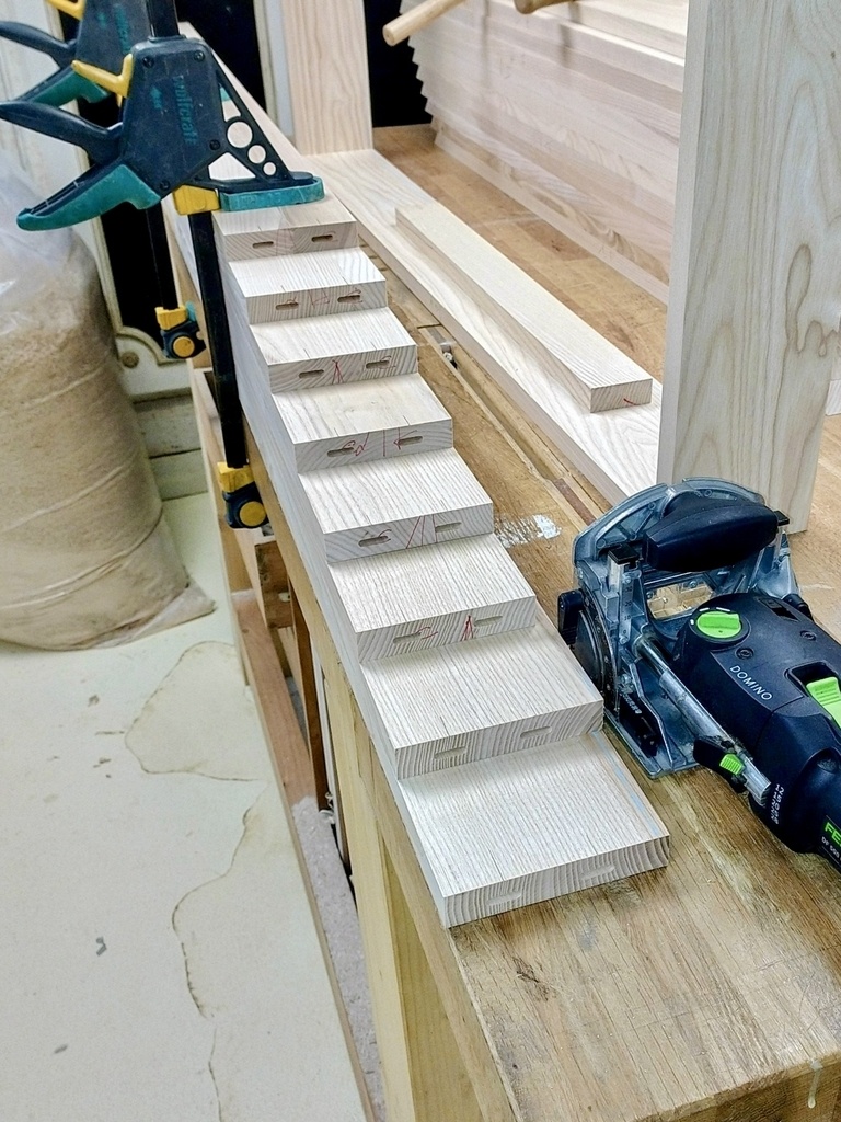 Coupes d'onglets, usinages en série pour des assemblages par dominos et clamex assurant simplicité du montage en solo chez les clients.