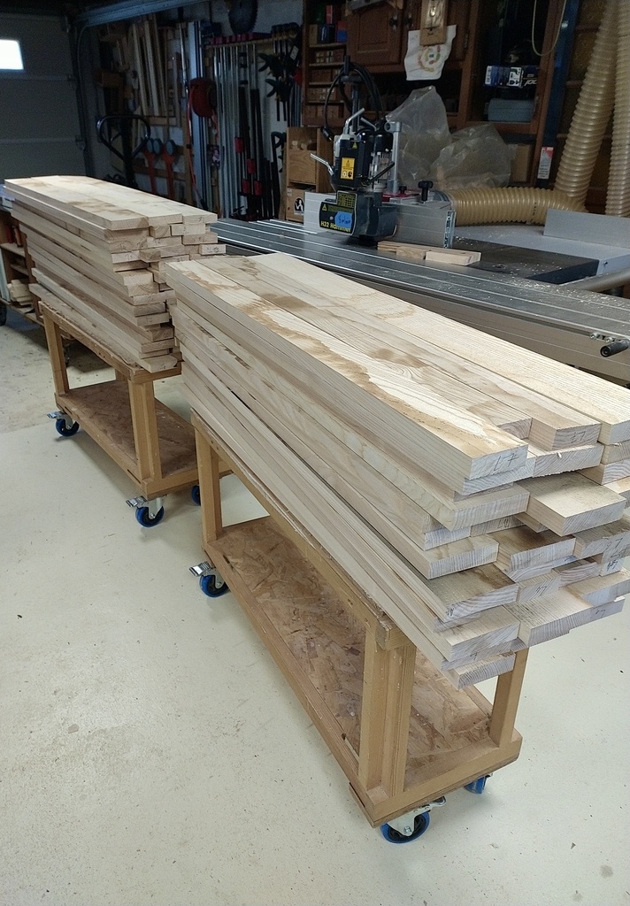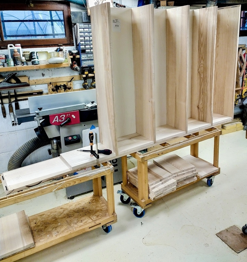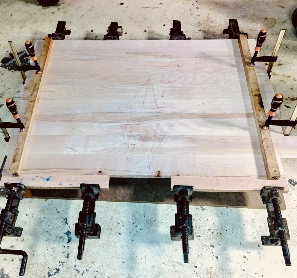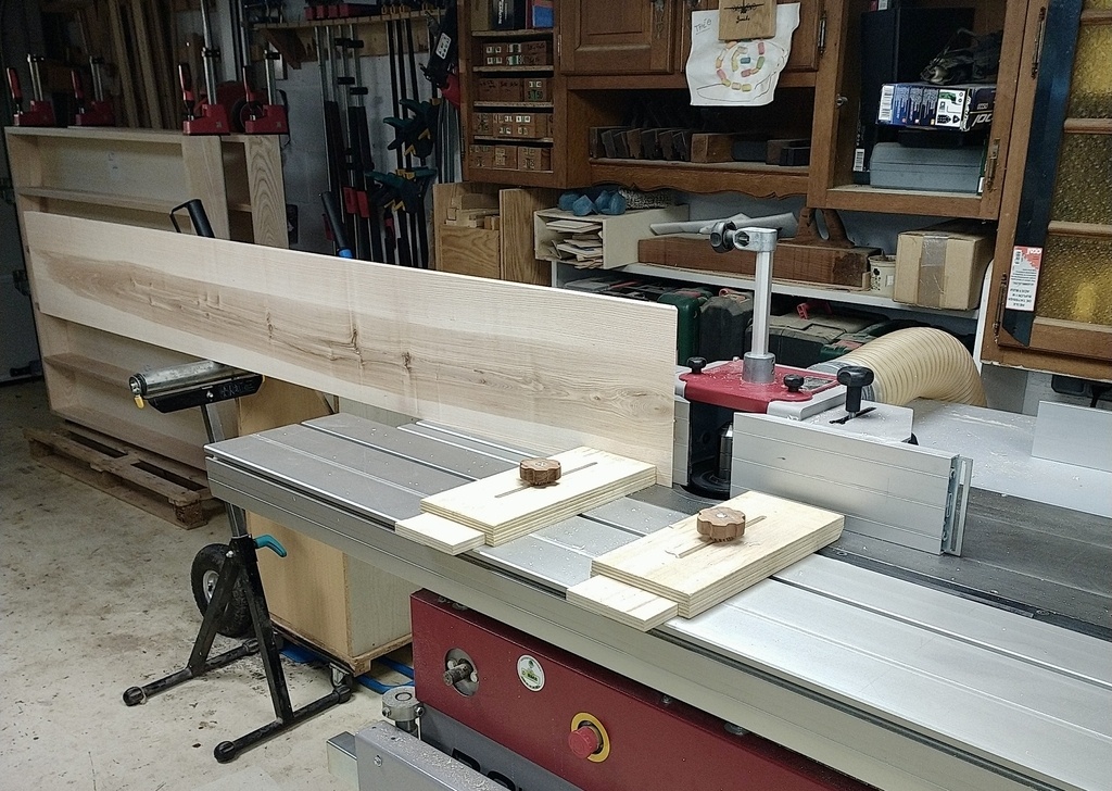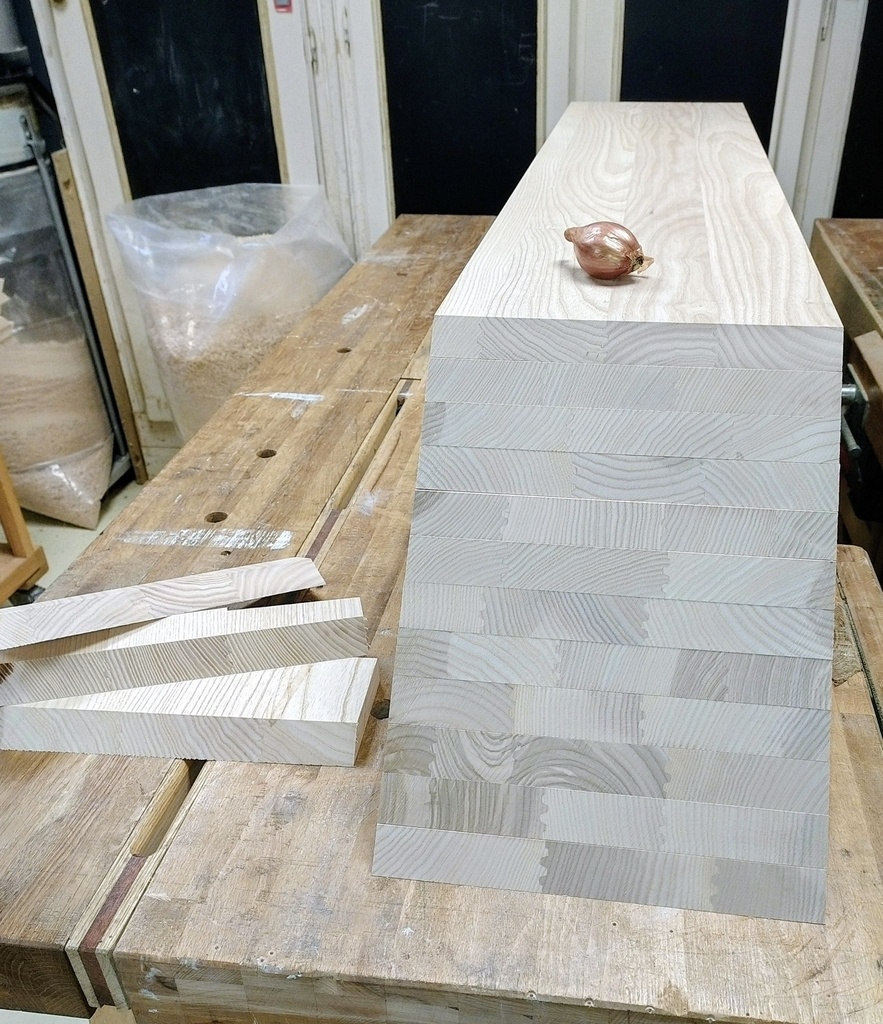 J'ai bouveté à enture multiples en laissant 8 dixièmes de plus que l'épaisseur finale. J'ai repassé mes plateaux à la rabotteuse sur chaque face 4 dixième pour limiter les heures de ponçage.