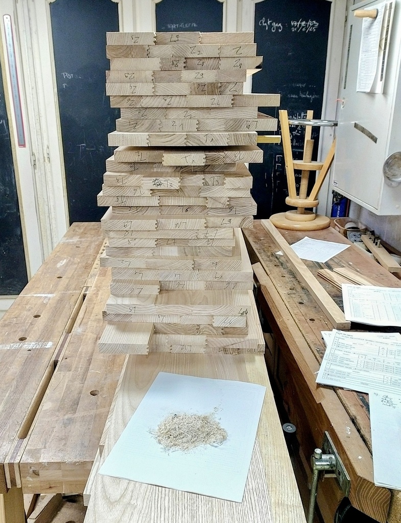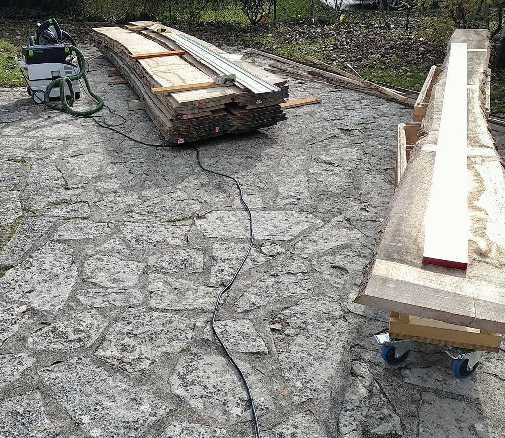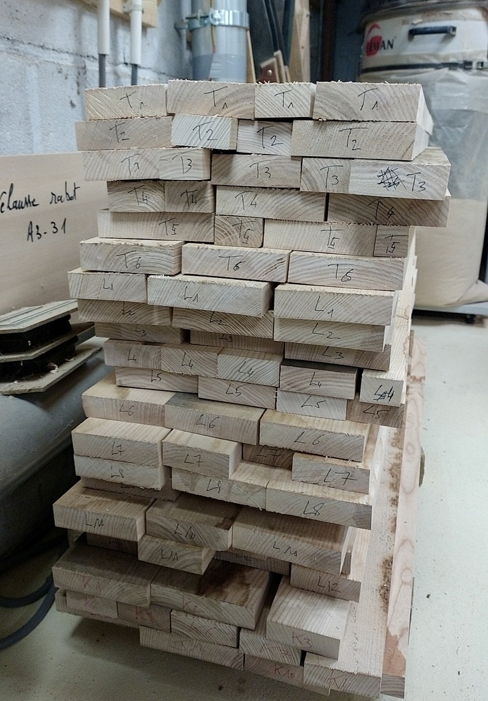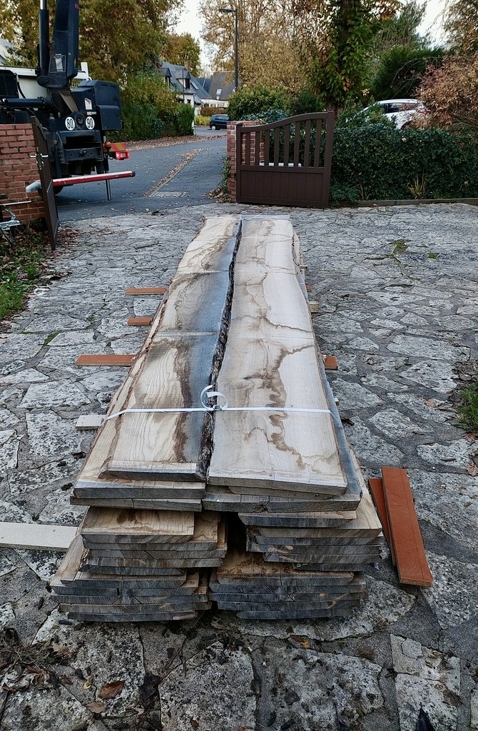 Quatres plots complets pour ce projet. Pré-débit en extérieur avant délignage et entreposage à l'atelier quelques semaines avant corroyage.