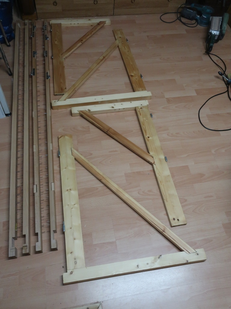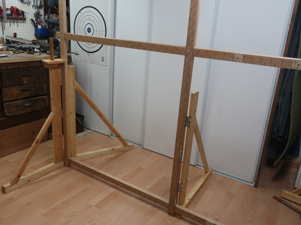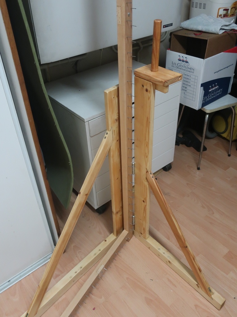 Cadre a tufter modulable (de 200 X 200 à 100 X 100 cm) et pliant et démontable réalisé pour ma fille. Il sert à tendre un tissu (toile de moine) pour réaliser un tapis en laine avec un pistolet à tufter. Cadre en hêtre (découpe, dego, rabot au combiné), entailles à mi bois à la défonceuse; Pieds en sapin. Les pieds avants et arrières sur gond sont pliants et démontables. Des cales dans les encoches du cadre non utilisées permettent de mettre aussi les clous pour tendre le tissu. 2 dévidoirs à fil de laine posés sur les pieds avants. Tout le bois récupéré "aux encombrants"