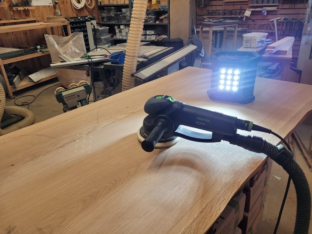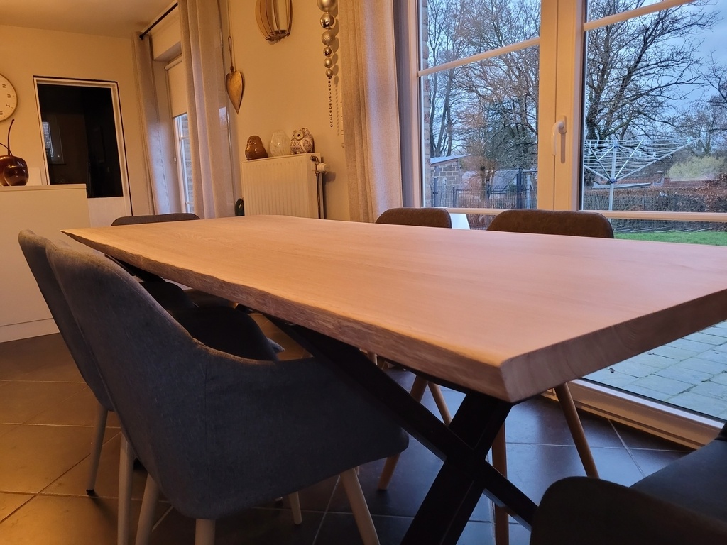 Petite réalisation sans prétention d'une table en chêne massif 'Live Edge' (les côtés de la table ne sont pas droits mais suivent la forme du tronc de l'arbre).