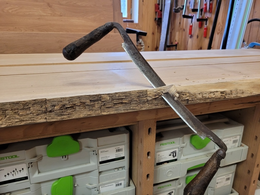 L'occasion pour moi de sortir la plane afin d'écorcer les côtés de la table.
