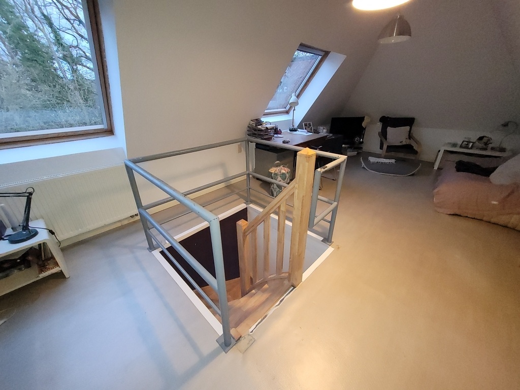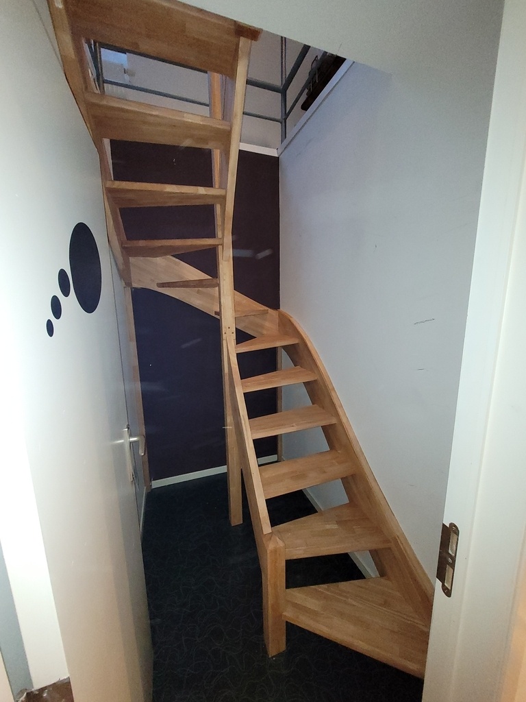 Cet escalier d'accès à une chambre dans les combles n'est sans doute pas le plus prestigieux mais requiert une bonne conception dès le départ; il prend en effet l'entièreté du cagibi dans lequel il est posé tout en permettant l'ouverture de la porte.