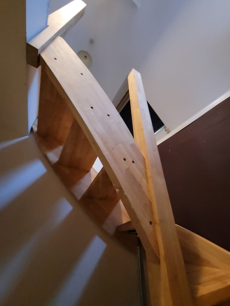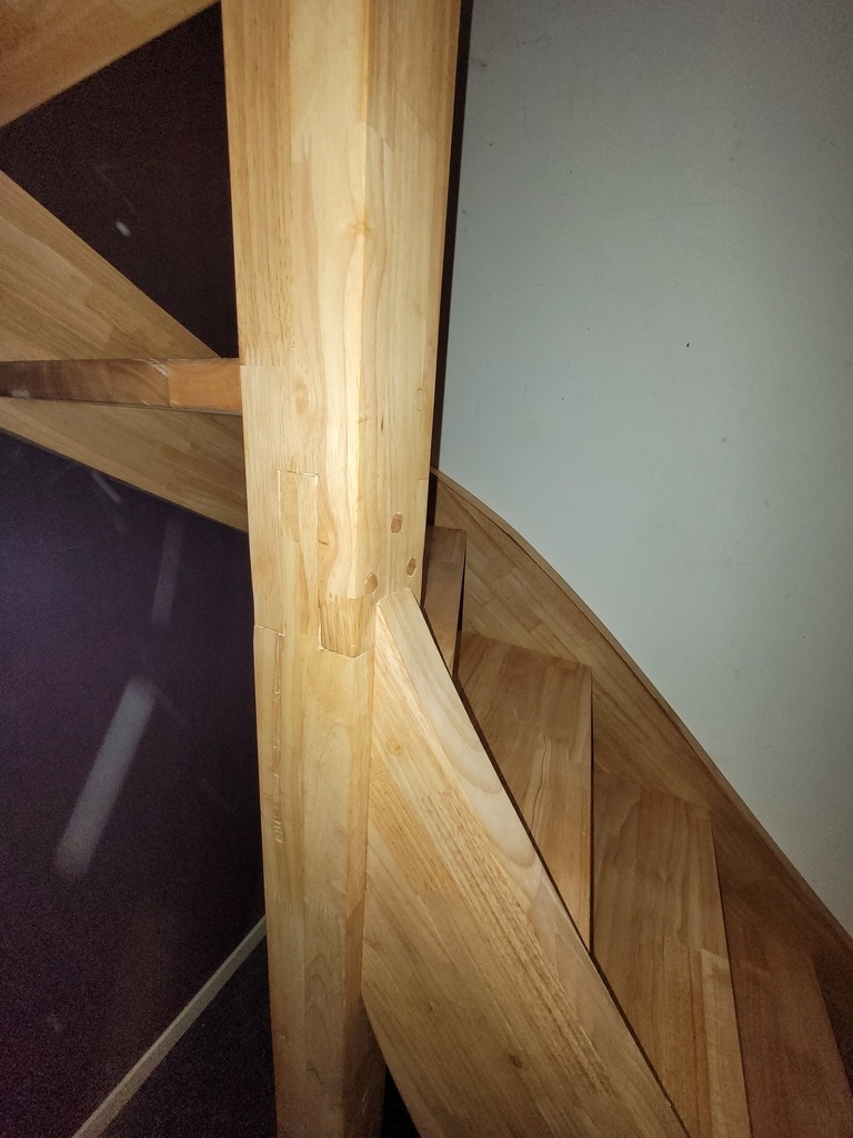 Les pièces ont dès lors été montées à l'étage où les volées intermédiaire et haute ont été assemblées avec les poteaux, puis descendu dans la trémie (1 cm de jeu dans chaque direction et angles de murs non droits); on vient y emboiter le limon de nuit et les marches 'pendantes' côté jour pour finalement y glisser l'assemblage bas du poteau central, limon de jour de première volée et poteau de départ. Le poteau central est donc en deux pièce avec assemblage par enfourchement et chevillé.