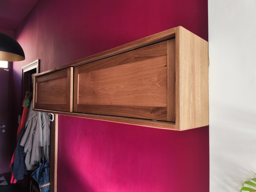 Des meubles haut et une colonne vitrée sur un plan de travail.