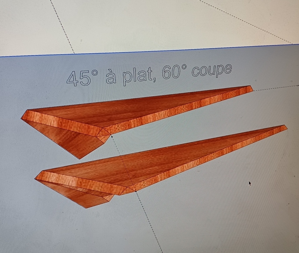 L'angle total est inférieur à 90°, donc il faut créer des pointes plus fines que 45° dans les deux pièces pour cacher le bois de bout et c'est toujours beaucoup de chipotes. Ici j'essayais de faire un truc facile à fabriquer.