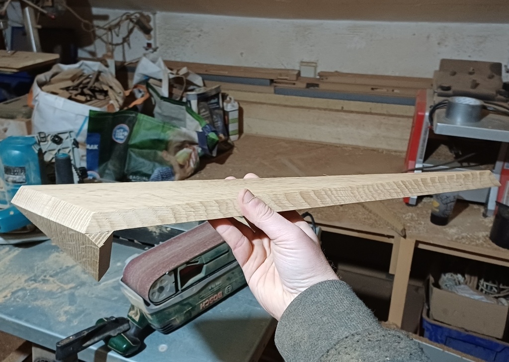 Une variation que je serai curieux de voir serait avec la pièce horizontale inchangée, et « l'équerre » du dessous coupé plus courte, sans le petit triangle en bois de bout : l’arête inférieure viendrait rencontrer l’angle saillante de la tablette. Le chant inférieur de « l’équerre » arriverait sous la tablette, ça renforcerai l’aspect pli.