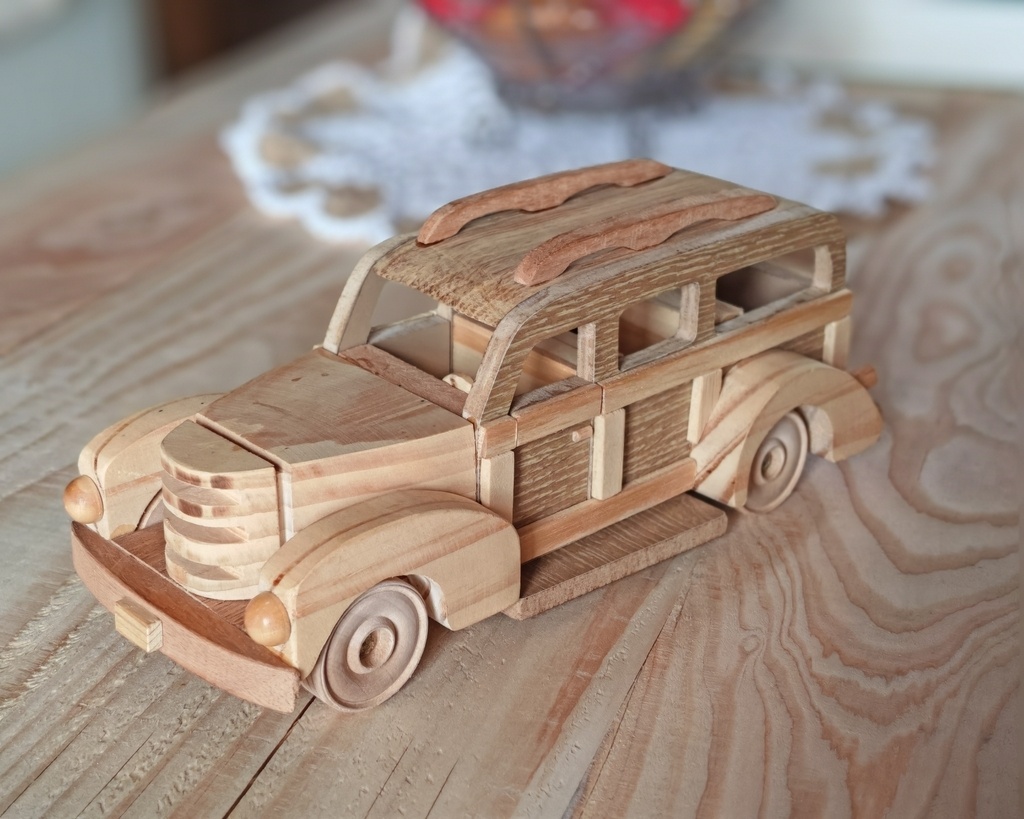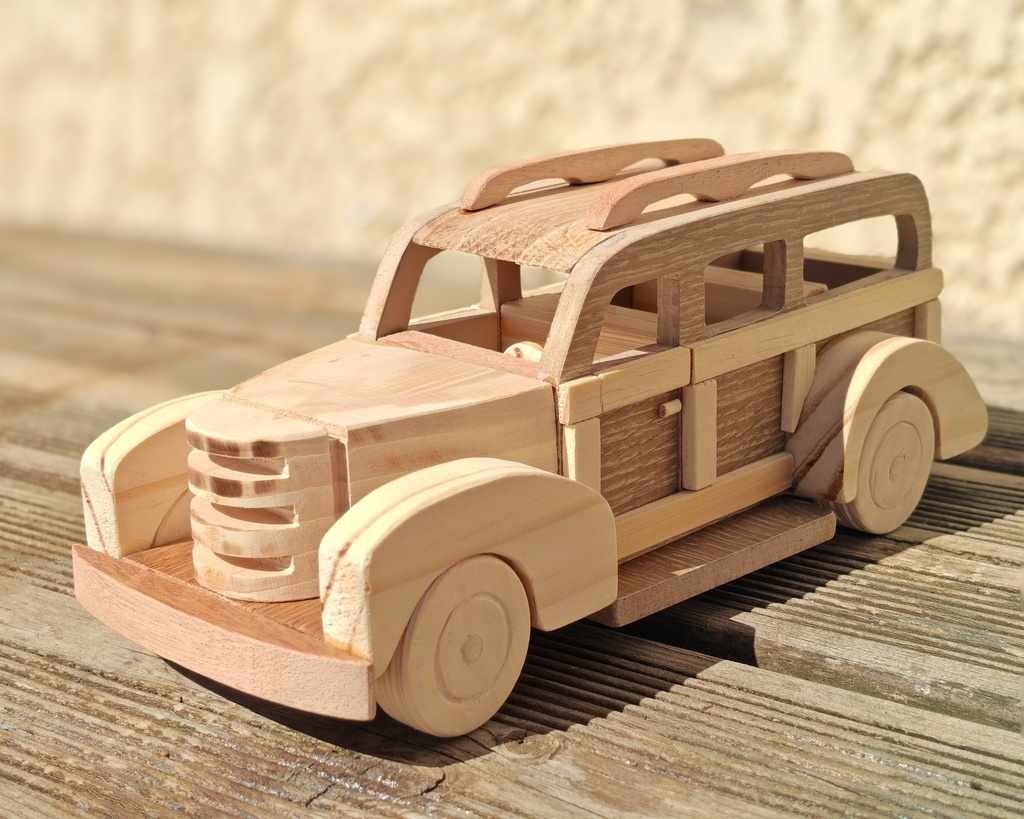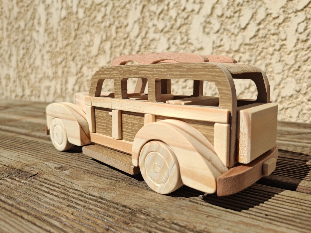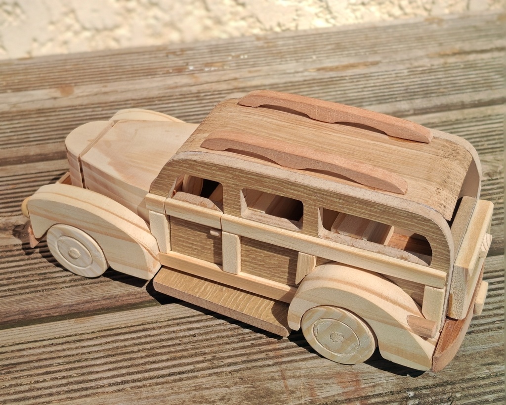bonjour a tous , voici un nouveau break estate wagon en bois de palette et un reste de parquet , les dimensions sont de 22 cm par 12 de large et 12 de haut , aucune finition juste un ponçage