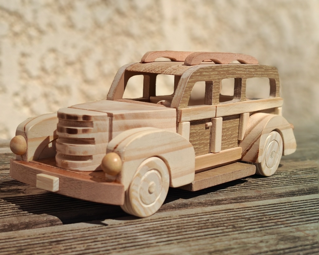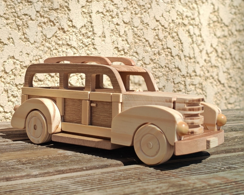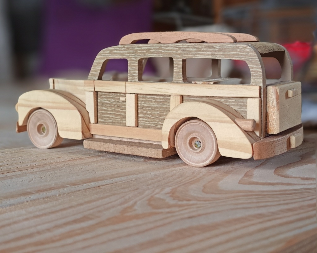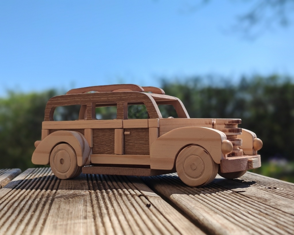 bonjour a tous , voici un nouveau break estate wagon en bois de palette et un reste de parquet , les dimensions sont de 22 cm par 12 de large et 12 de haut , aucune finition juste un ponçage