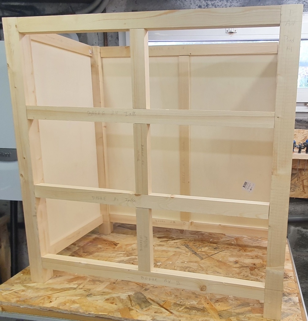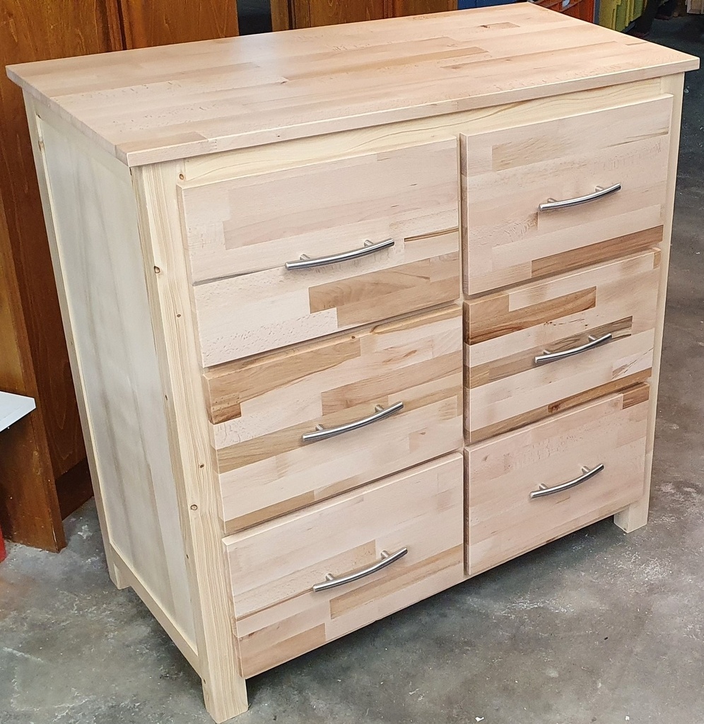 la structure de la commode est faite à partir de tasseaux en pin assemblés par tenons/mortaises. Les côtés et la face arrière de la commode sont en contreplaqué de 10 mm inséré dans les rainures des tasseaux. Les glissières ont été réalisées en bois exotique - forme classique en L. Les tiroirs sont en contreplaqué avec une façade en hêtre lamellé-collé. Le plateau est aussi en hêtre lamellé-collé.