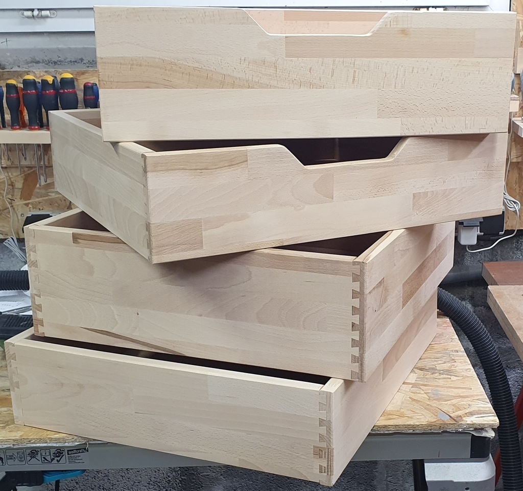 Les tiroirs sont en hêtre lamellé collé sauf pour le fond qui en contreplaqué. L'assemblage des différents éléments a été fait avec des queues d'aronde non débouchantes à laide d'un guide pour défonceuse CMT Orange Tools, le CMT300. Sur la vue d'ensemble, on peut voir des rainures sur les côtés des tiroirs qui accueillent les glissières fixées dans le placard bas.