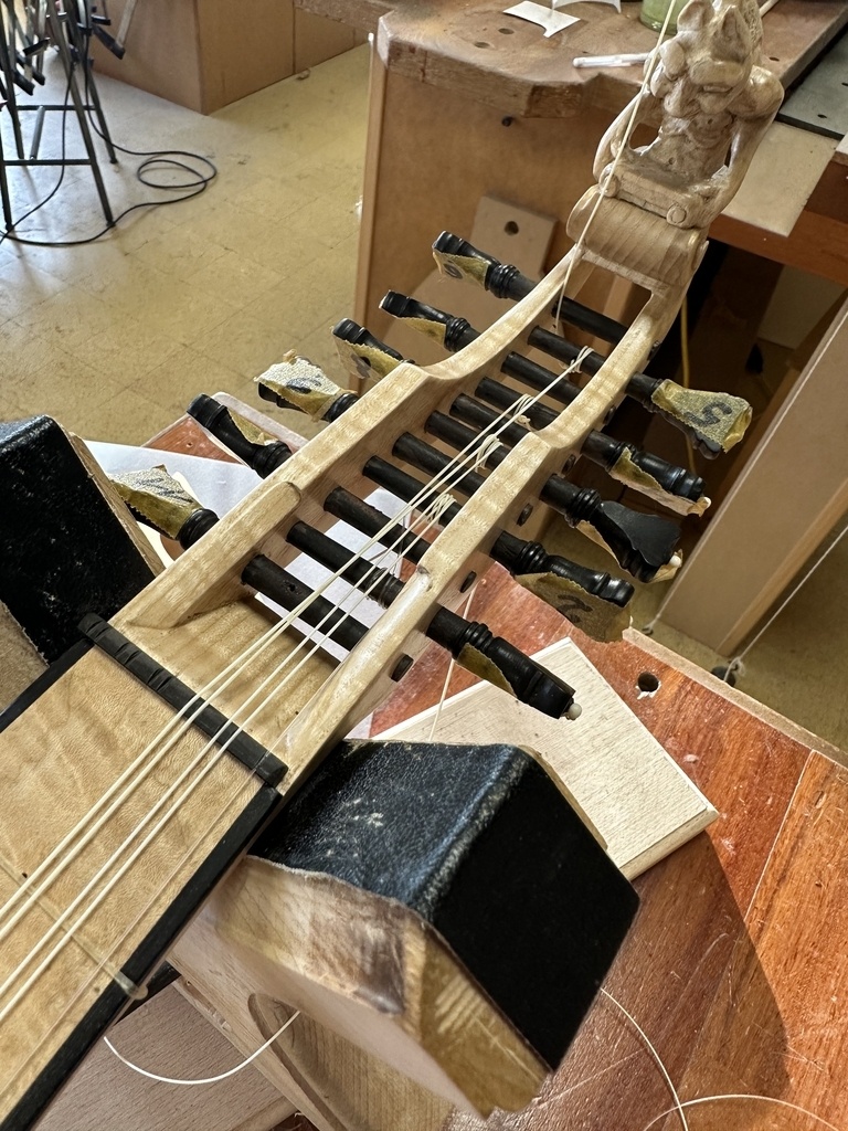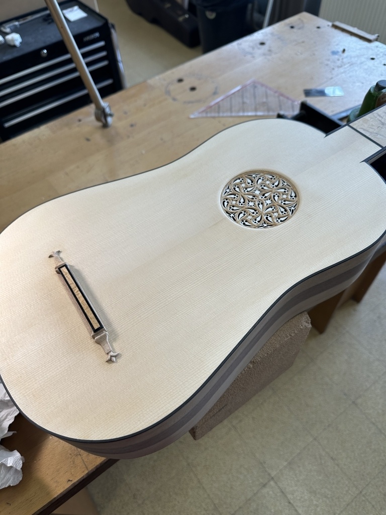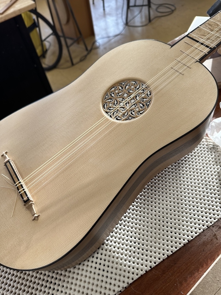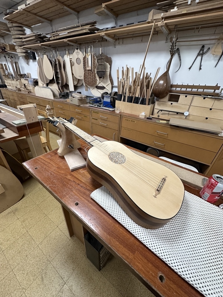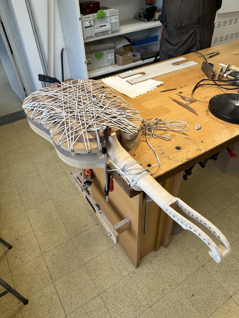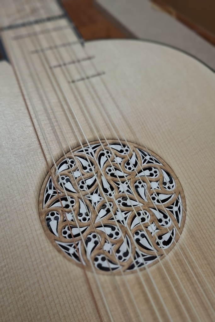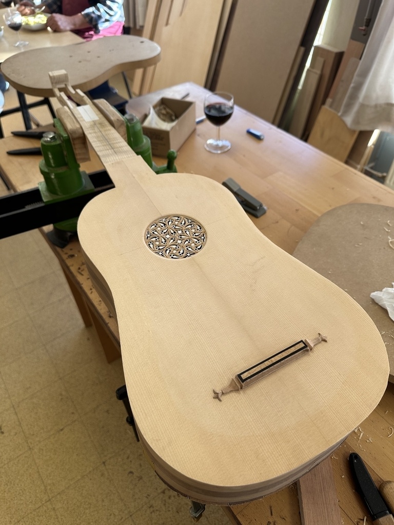 Comme juste à côté de notre atelier de marionnettes, s'est installé un atelier de lutherie, je ne voulais pas mourir idiot et j'ai voulu savoir comment on fabriquait un instrument à cordes grattées. Mes mentors, deux artistes exceptionnels, Renzo SALVADOR et Aurélien GOUX, m'ont proposé de réaliser une guitare de la Renaissance (Vihuela de mano) alliant de nombreuses techniques de lutherie et d'essences de bois (noyer, merisier, ébène, érable ondé, frêne ondé, ...) mais aussi de la sculpture. Je joins quelques photos des étapes de cette réalisation, une grande première pour moi.