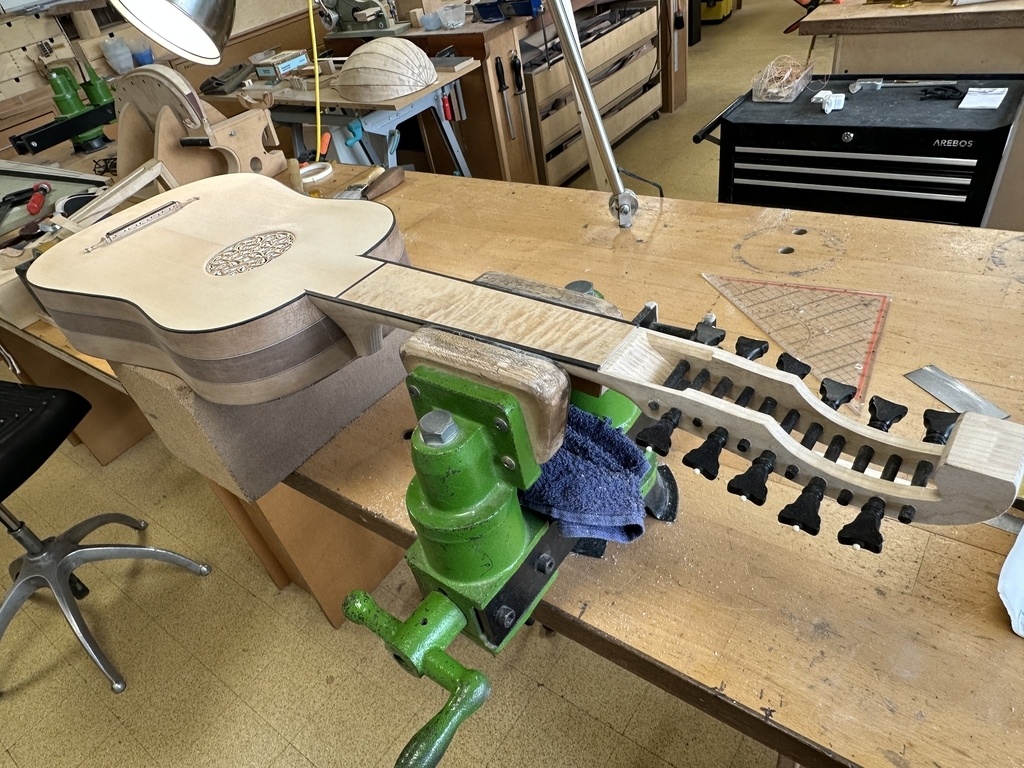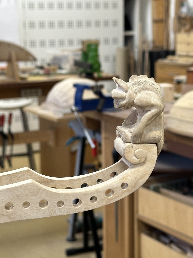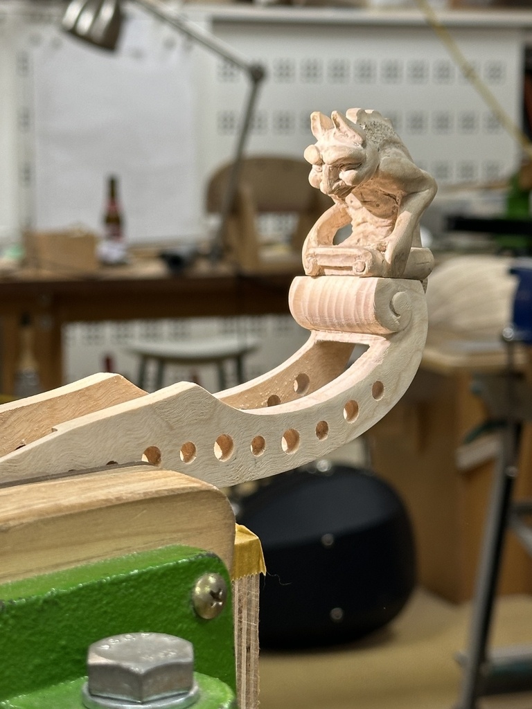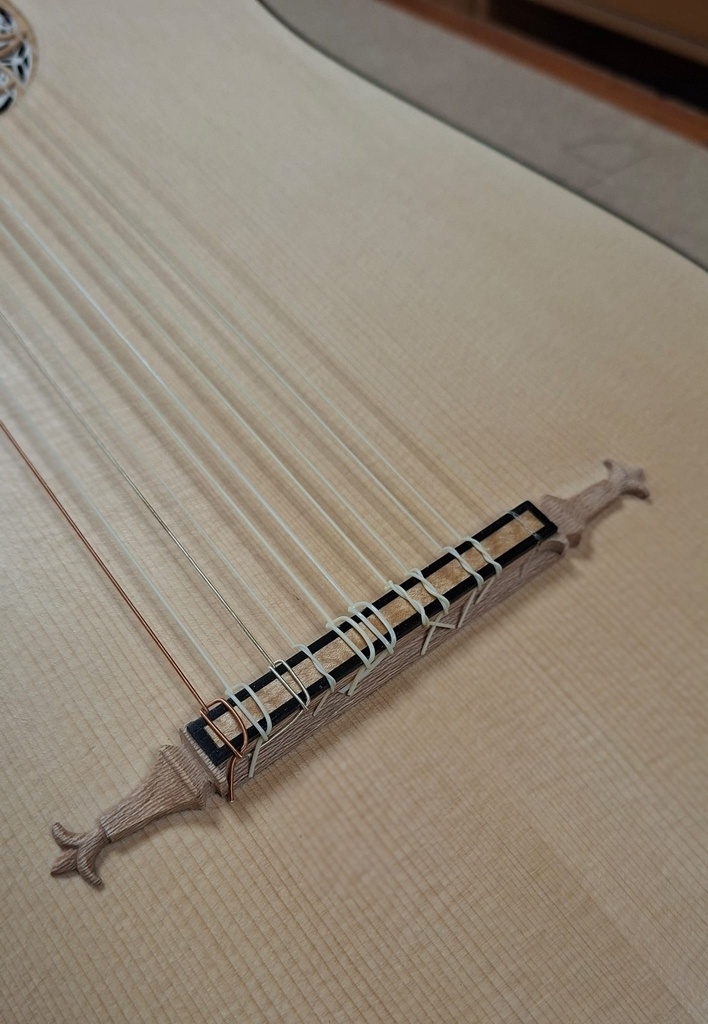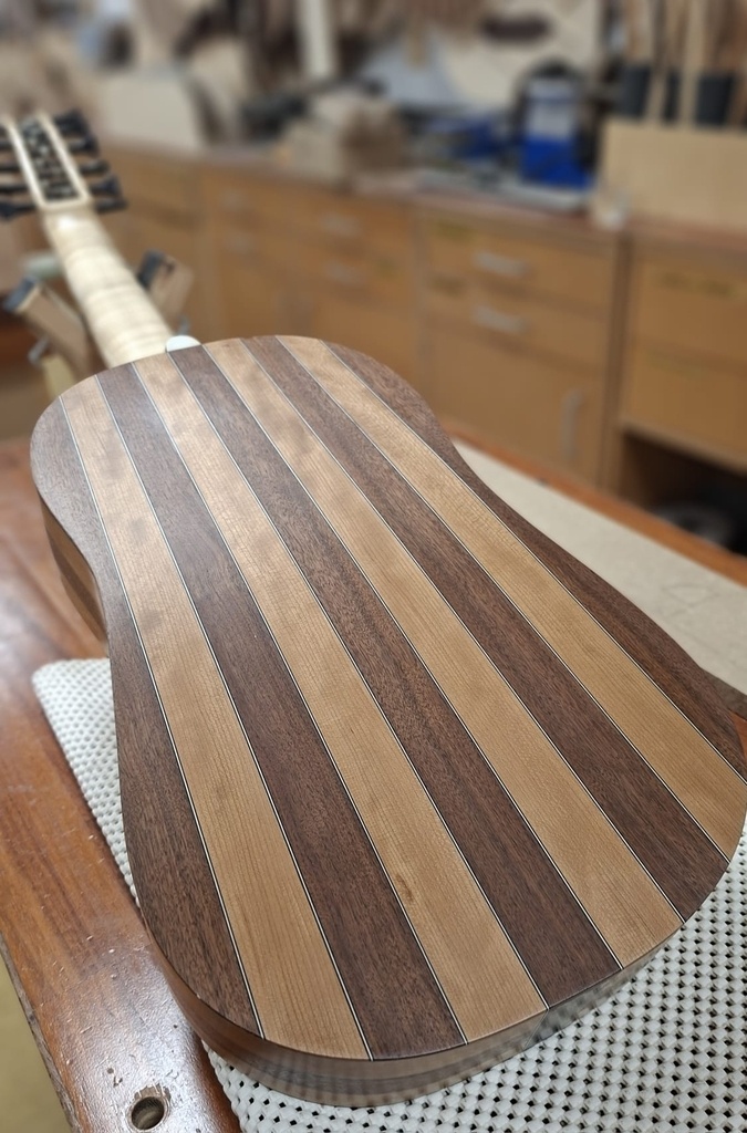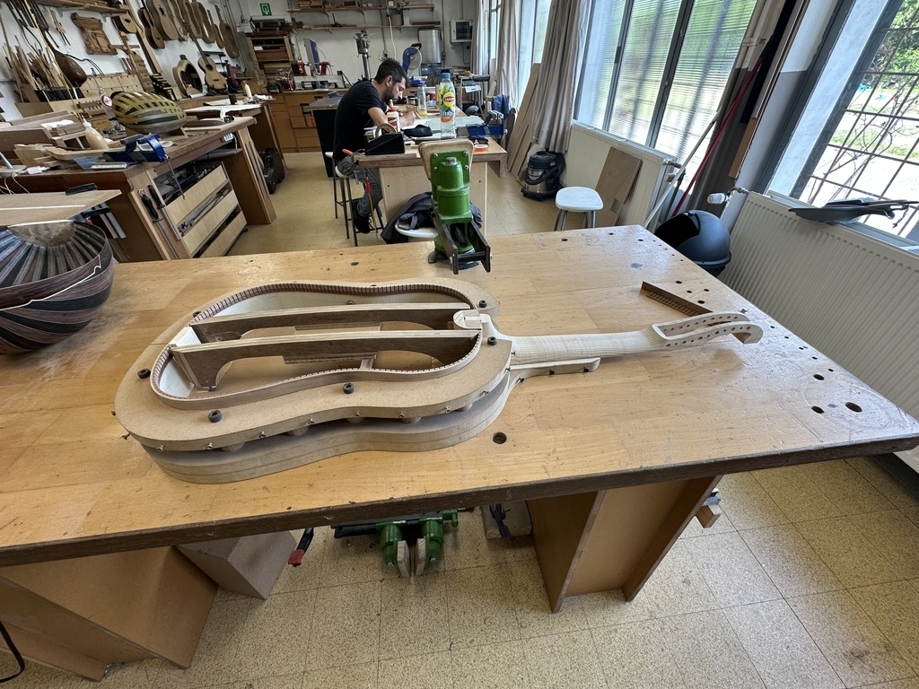 Comme juste à côté de notre atelier de marionnettes, s'est installé un atelier de lutherie, je ne voulais pas mourir idiot et j'ai voulu savoir comment on fabriquait un instrument à cordes grattées. Mes mentors, deux artistes exceptionnels, Renzo SALVADOR et Aurélien GOUX, m'ont proposé de réaliser une guitare de la Renaissance (Vihuela de mano) alliant de nombreuses techniques de lutherie et d'essences de bois (noyer, merisier, ébène, érable ondé, frêne ondé, ...) mais aussi de la sculpture. Je joins quelques photos des étapes de cette réalisation, une grande première pour moi.