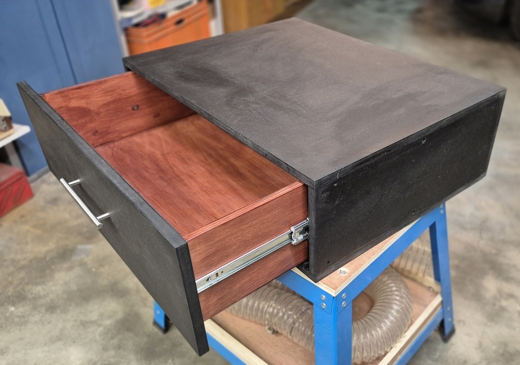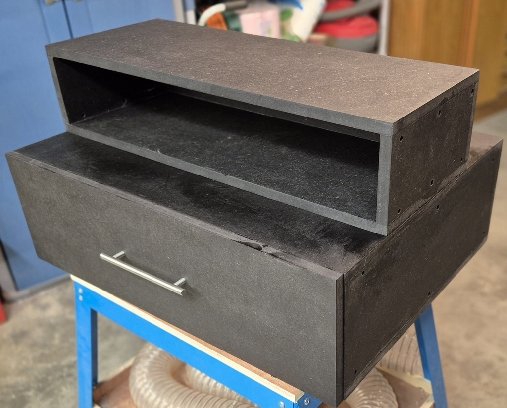 Les deux caissons sont en Valchromate noir et assemblés à l'aide de tourillons. Les tasseaux sont des tasseaux en pin qui ont été vernis avec du vernis "bois exotique" (je sais, je sais, c'est un peu de triche LOL). La liaison/assemblage entre les caissons et les tasseaux est faites par des boulons à tête plate. Le caisson du bas possède un tiroir avec coulisses à sortie totale pour "charge lourde". Le tiroir est en contreplaqué de 15 mm (finition vernis exotique). Les caissons ont été enduit d'une préparation à base d'huile de lin pour obtenir une couleur uniforme et plus foncée que d'origine.