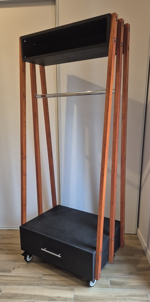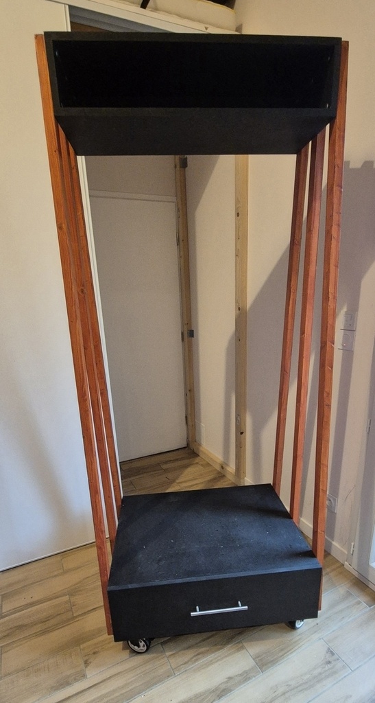 Cette penderie mobile est inspirée de celle de Hoyez que j'ai trouvée superbe - notamment cette association Valchromate noir et bois exotique (cf. lien inspiration). Mais, je ne voulais pas faire tout le travail d'assemblage qu'il a du faire sur le côté Gauche de la penderie. J'ai donc simplifié. J'ai fait plusieurs plans que j'ai soumis à l'une de mes petites filles - penderie pour sa chambre. J'ai ensuite réalisé celui qu'elle a choisi.