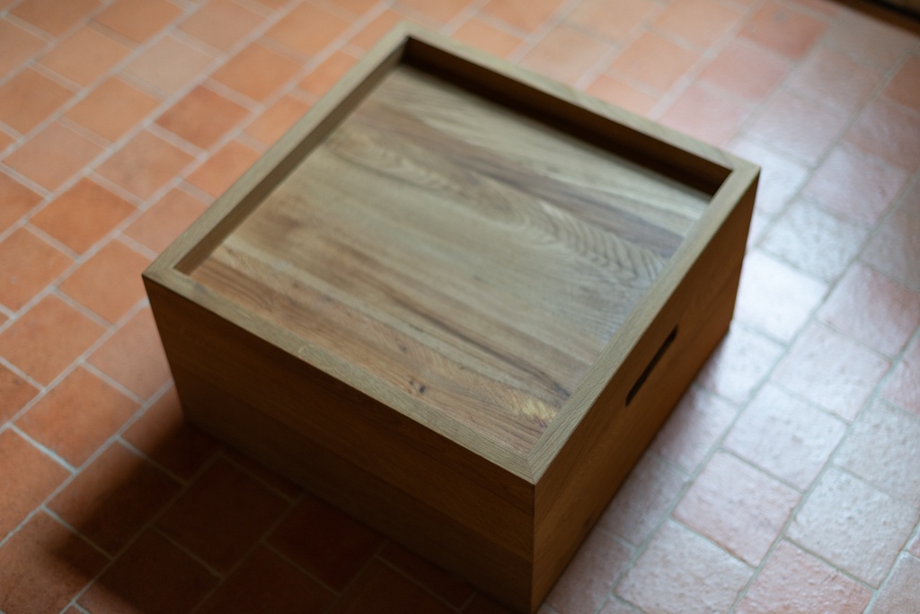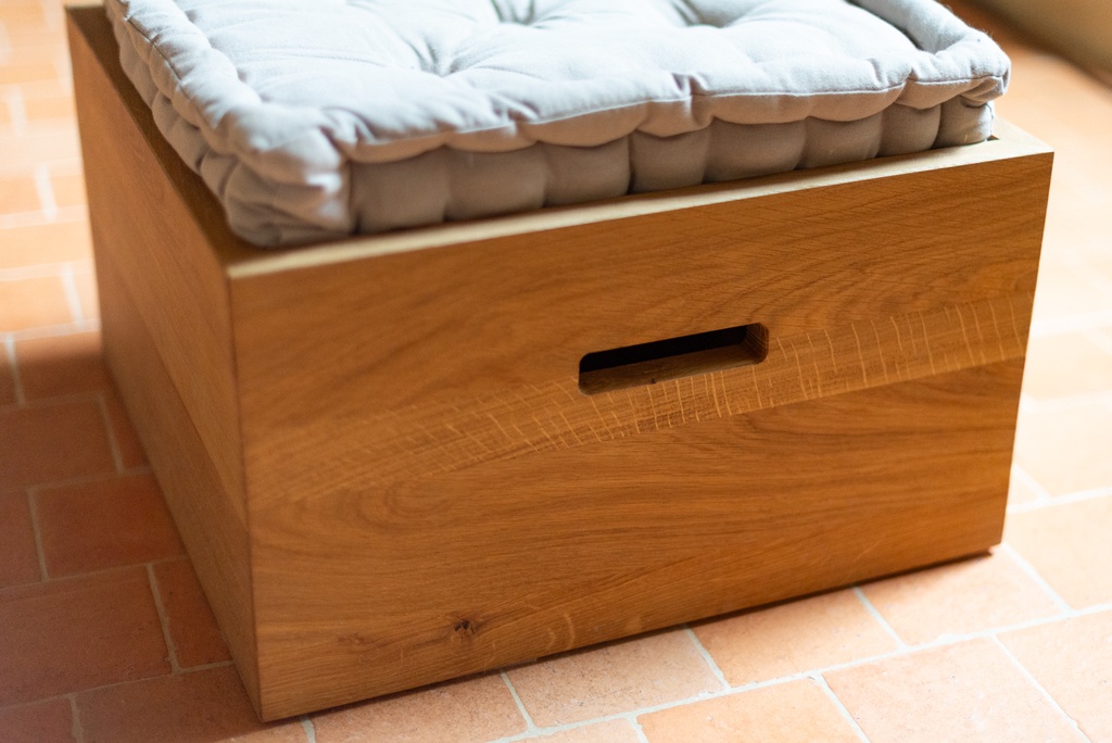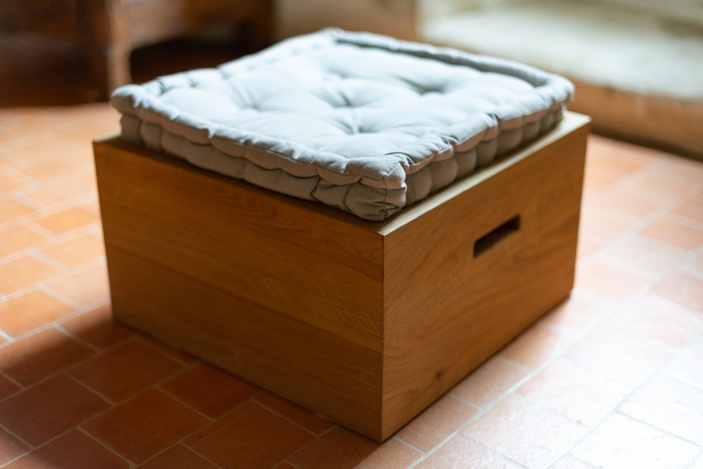 Repose pieds pour glisser sous le bureau qui sert aussi de pouf. En chêne avec des coupes d'onglet et plateau de 18mm dans une rainure. Taille standard pour ce types de coussins de 40*40cm.