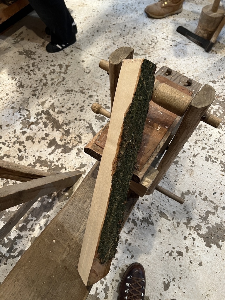 J'ai beaucoup aimé le travail du bois vert: ça sent bon et ça fait utiliser des outils différents comme la plane et la wastringue. La plane passe dans le frêne comme dans du beurre. Le banc d'âne est vraiment comfortable pour travailler.