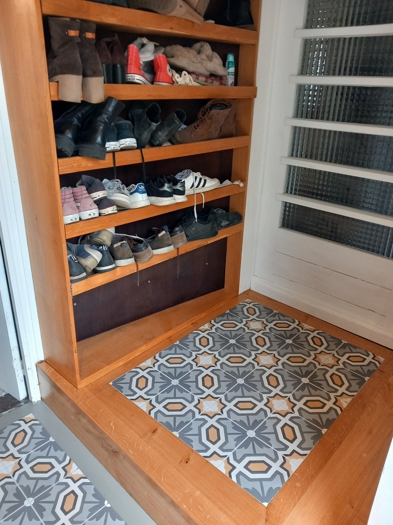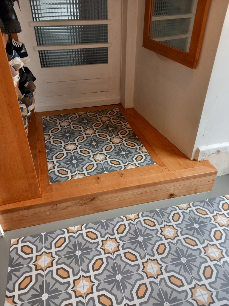 Une fois le carrelage posé à peu près au centre dans cette entrée où RIEN, mais alors RIEN DE RIEN n'est droit, le casse-tête peut commencer.