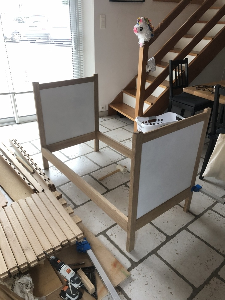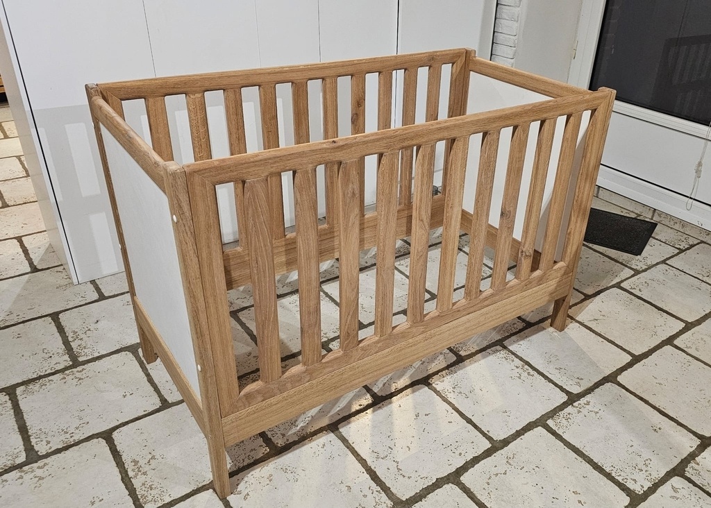 Lit 120x60cm en chêne massif + contre-plaqué pour les 2 panneaux et les lattes du sommier.