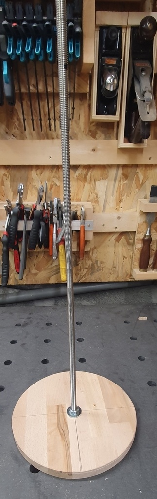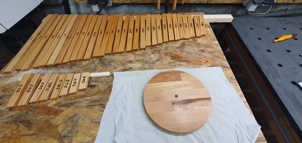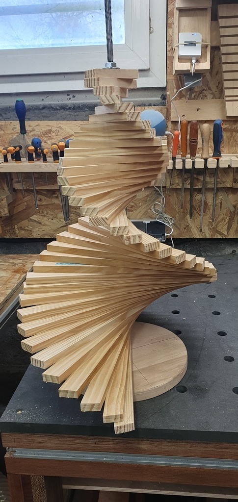 Arbre de Noël réalisé à partir de petits tasseaux en Pin. Il y a un 1cm de moins entre deux tasseaux consécutifs et le bout du tasseaux a une coupe d'onglet avec 5 mm de moins entre les deux côtés. Ceci permet de donner une forme de spirale à l'arbre de Noël quand on le désire.