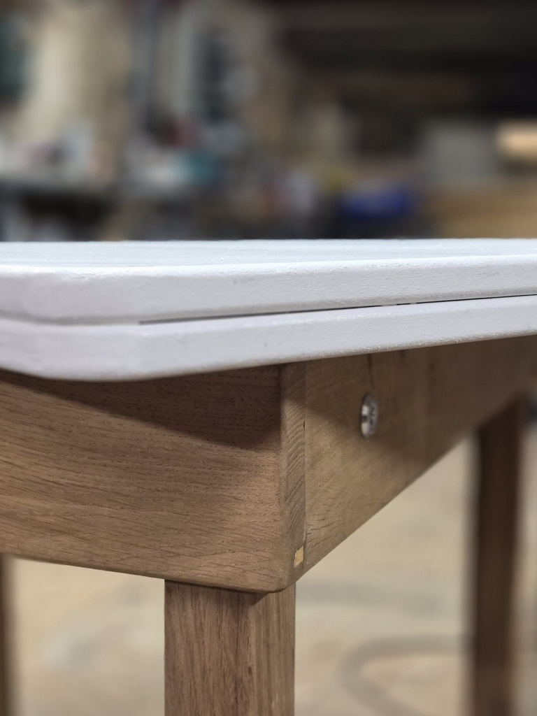 La table est réalisée en chêne et en aggloméré pour la plateau qui peut se déplier en deux. Un coffre sous la table est accessible.Il y a une charnière pour le faire pivoter. Le plateau est troplours a mon sens.