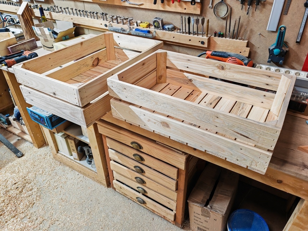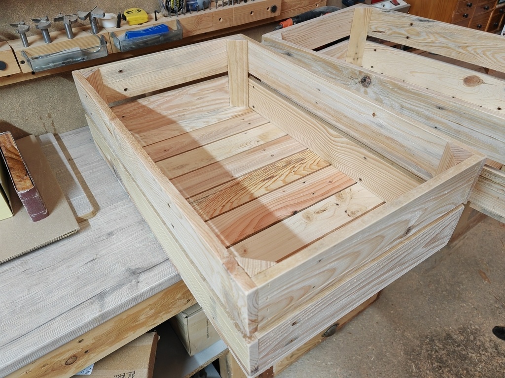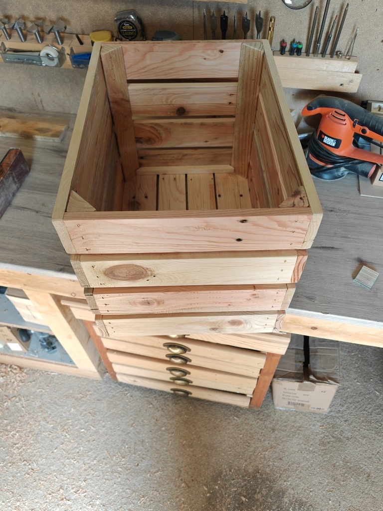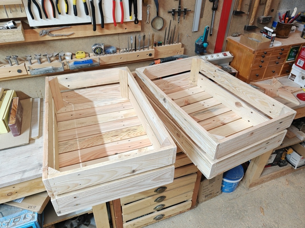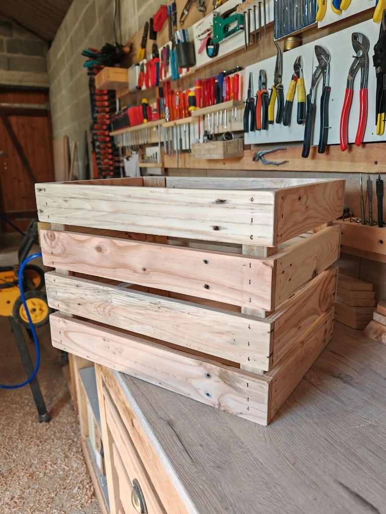 bonjour a tous , voici plusieurs caisses en bois de différentes hauteur et formes pour un ami qui est maraicher et qui fait les marchés aux légumes bonne journée