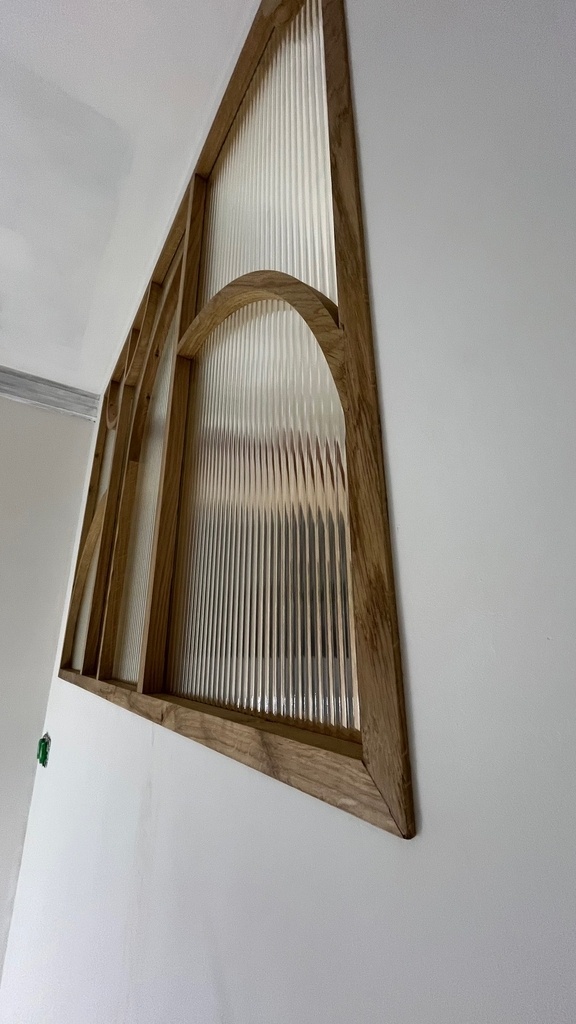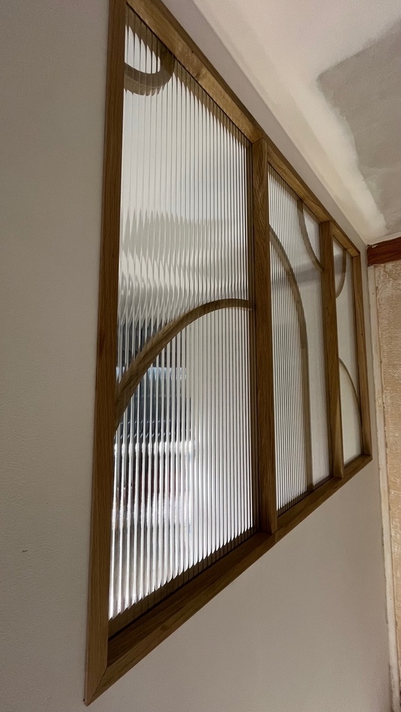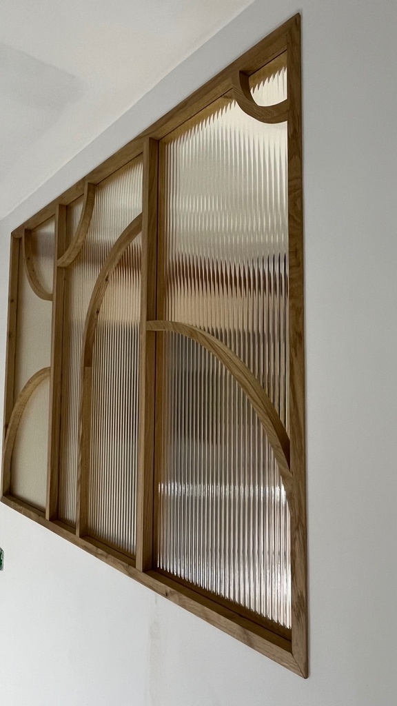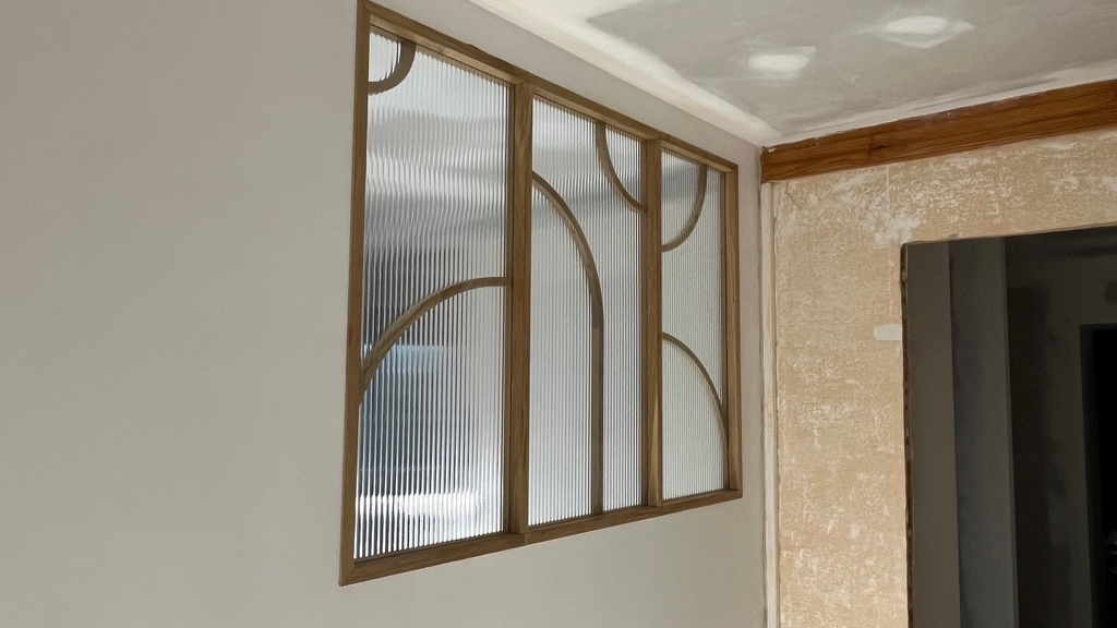 Réalisation d'une verrière (1400 x 1000) d'influence Art Déco en chêne massif et vernis naturel 5gl avec trois verres flûte, pour un habillage de mûr de cuisine.