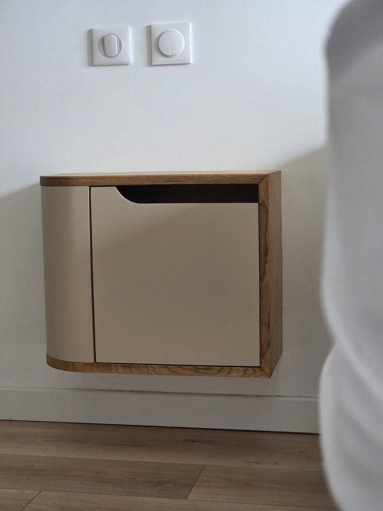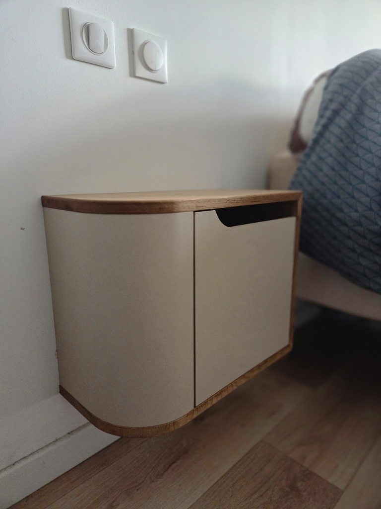 Fabrication de deux chevets mêlant médium hydro pour le corps apparent et châtaignier pour les tablettes sandwich/aménagement intérieur.