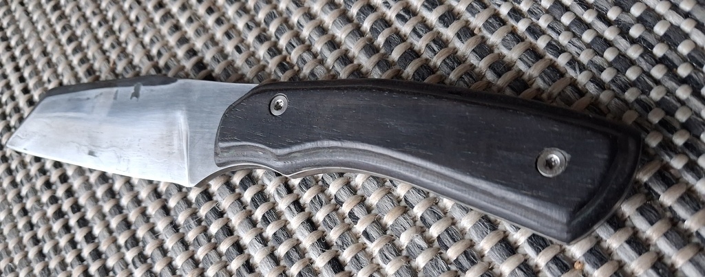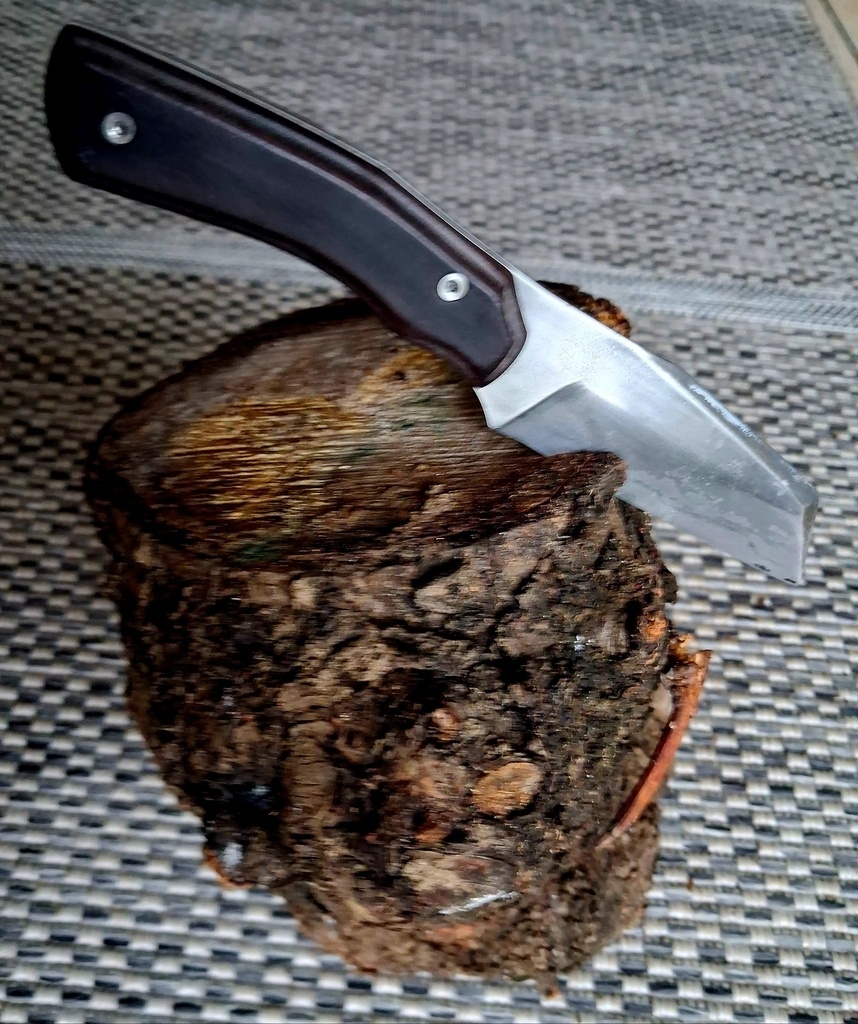 Couteau droit, plaquette manche bois exotique (profane) , trempe sélective, acier xc75,vis m3 tranchant rasoir