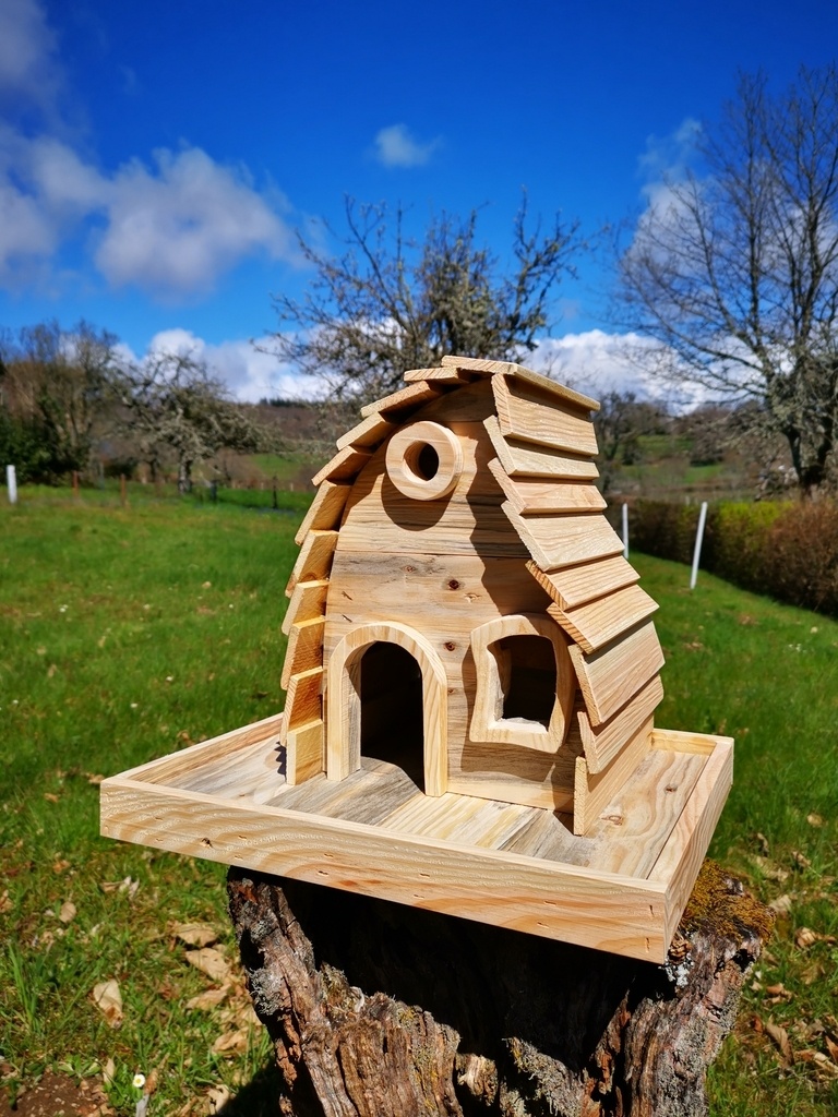 bonjour voici différentes mangeoires a oiseaux en bois de riche (palette) certaines sont couleur naturel et d'autres brulé (suivant le destinataire) bonne journée