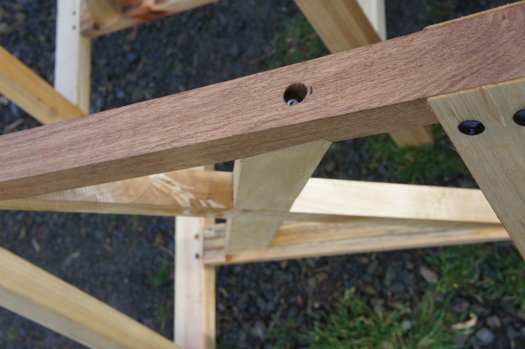 Les piétement, c'est de la récup, un mélange de peuplier, de douglas, de cyprés... Les traverses hautes sont en chêne. Les embrèvements de croix sont sécurisés par vis, sans tenon. Des tenons auraient commencés à sérieusement fragiliser les traverses, de petites sections. Les hauts de pieds sont à joints vifs, vissés. Le reste, c'est tenon mortaise chevillé. Hauteur 80 cm.