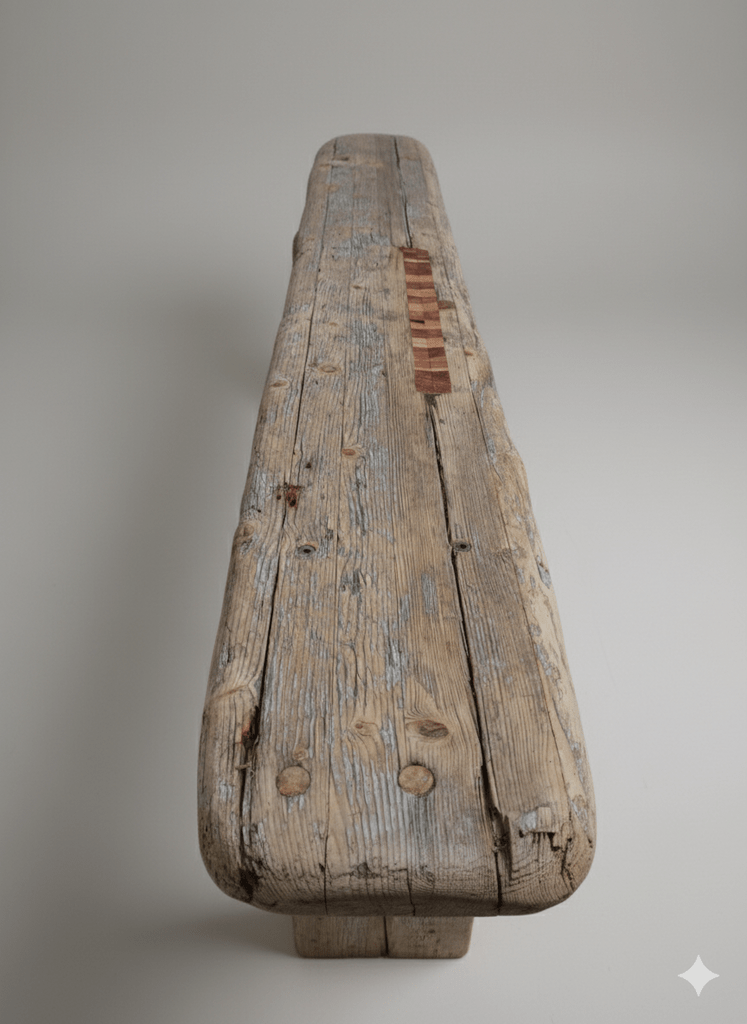 Il a été légèrement poncer mais aucune finition n'a été appliquée. J'ai incrusté une chute de modif a chevron pour comble un gros défaut du bois.