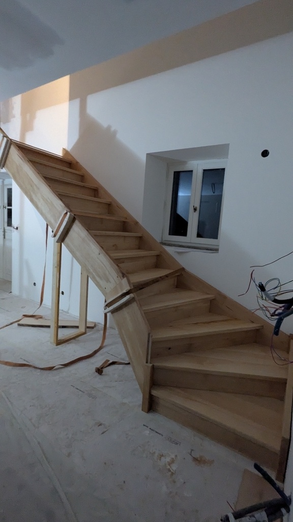 Je viens de finir mon premier escalier, un grand double quart tournant se faufilant dans une trémie.