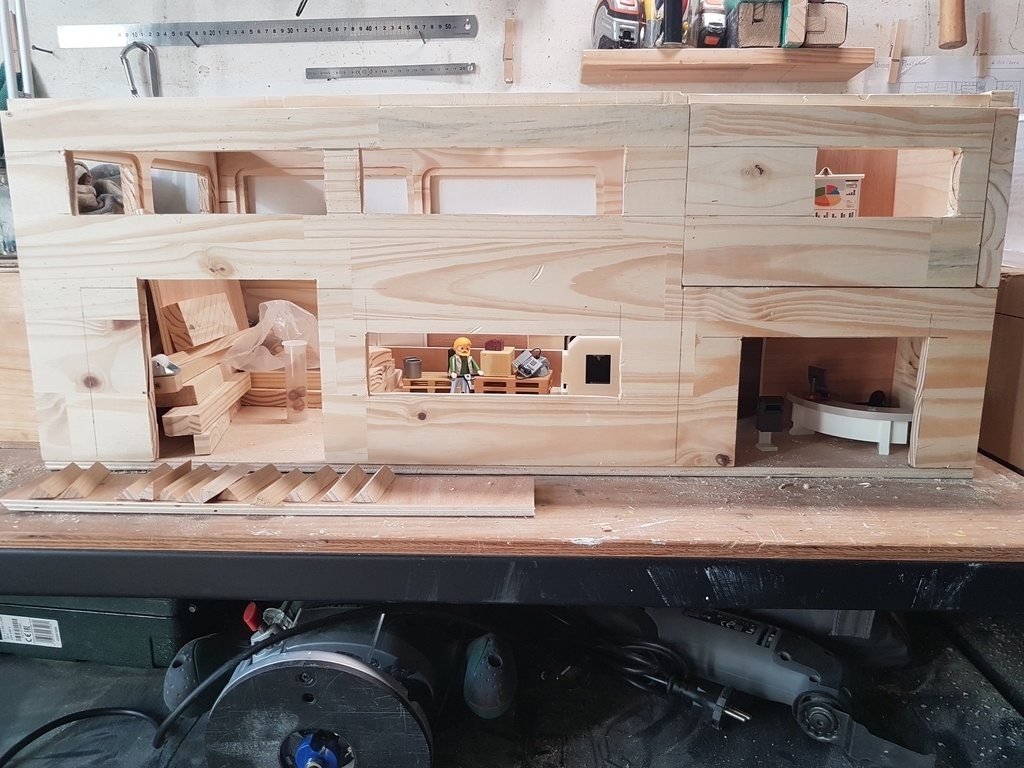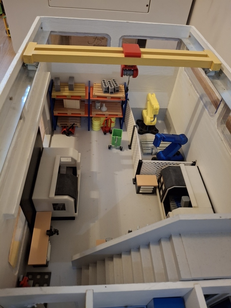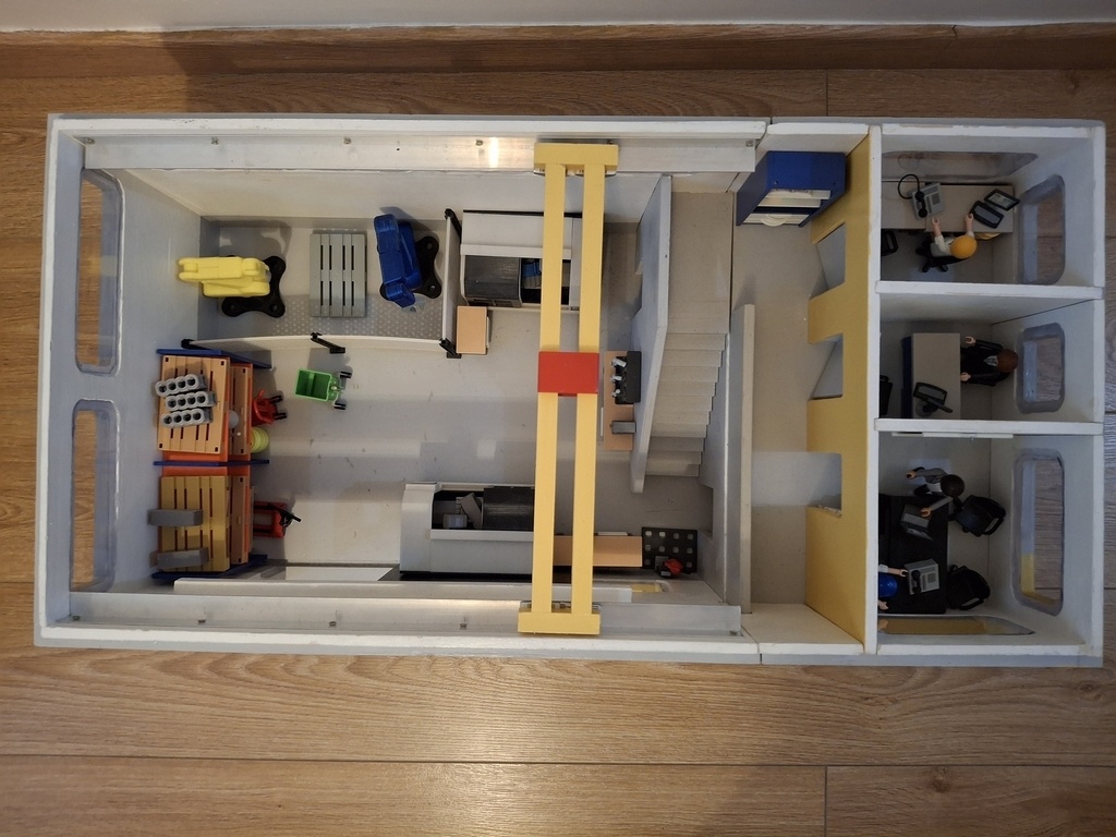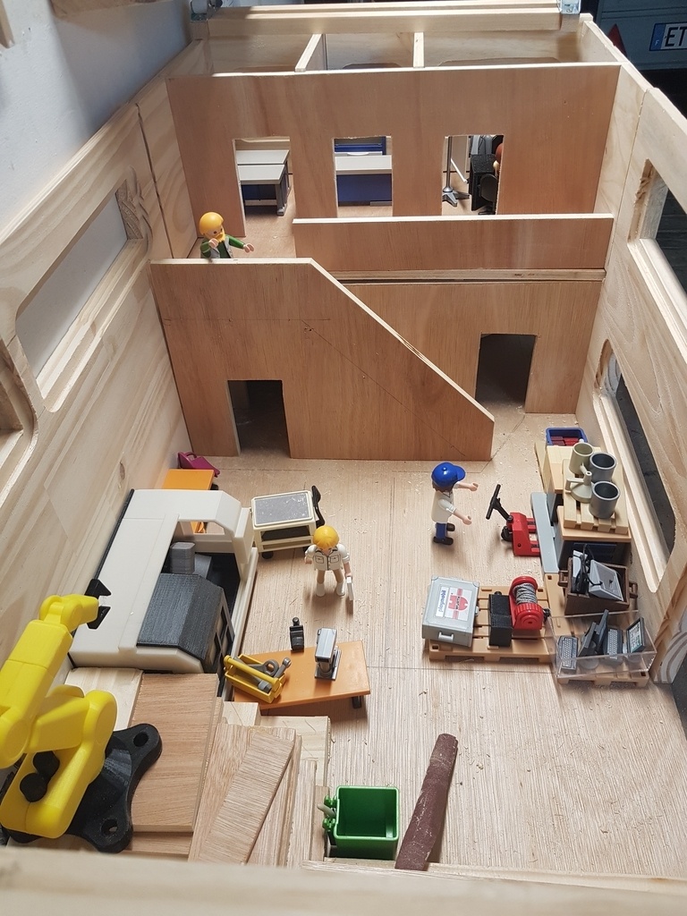 Atelier d'usinage pour Playmobils avec bureaux, salle de réunion et vestiaires.